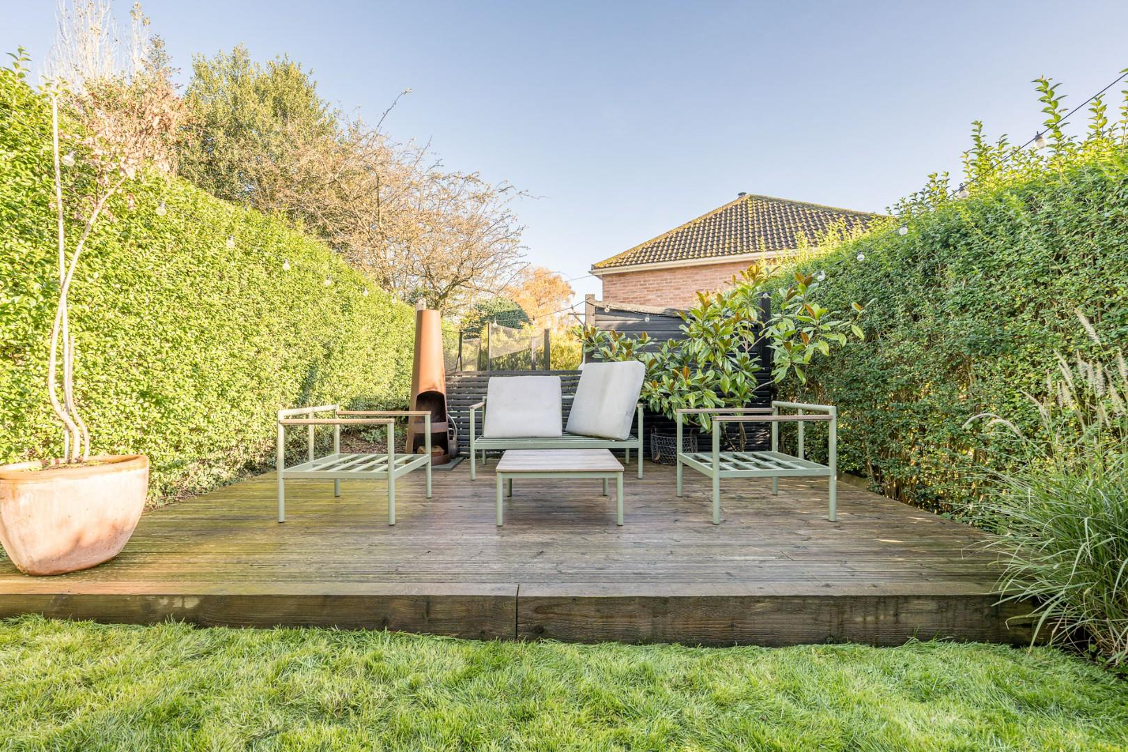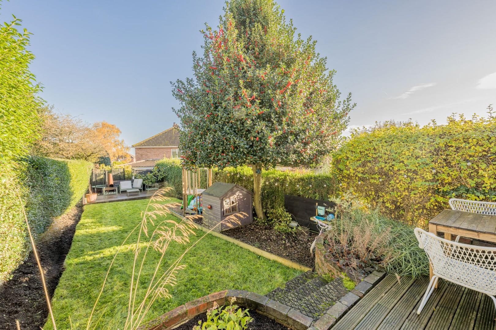 With a door leading from the kitchen diner, decked area to the front with lawn beyond and mature shrub borders