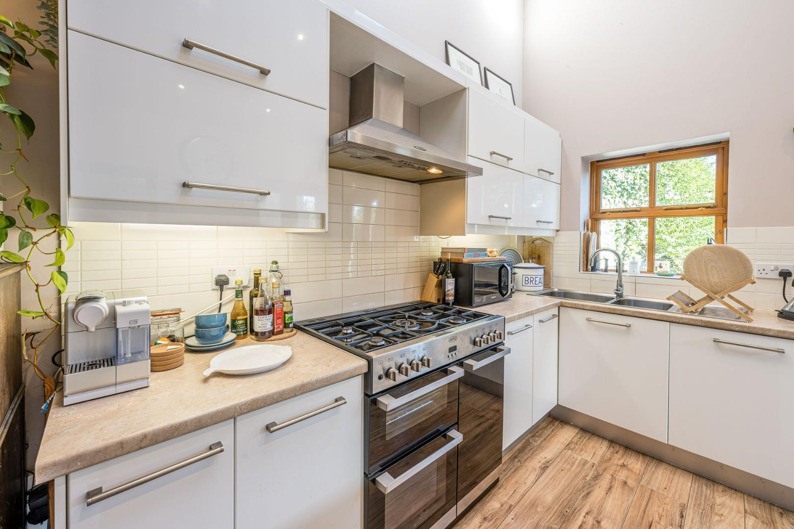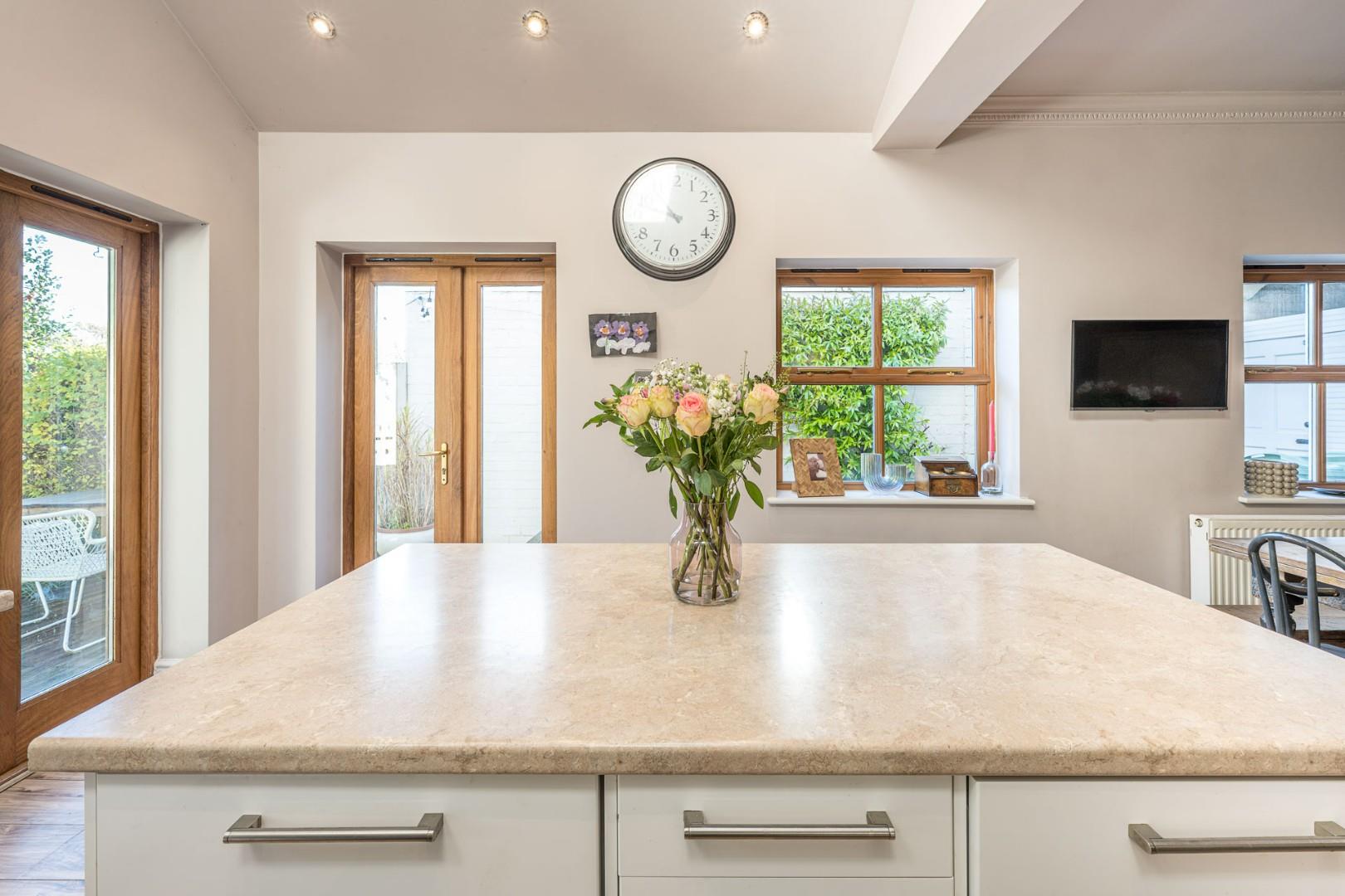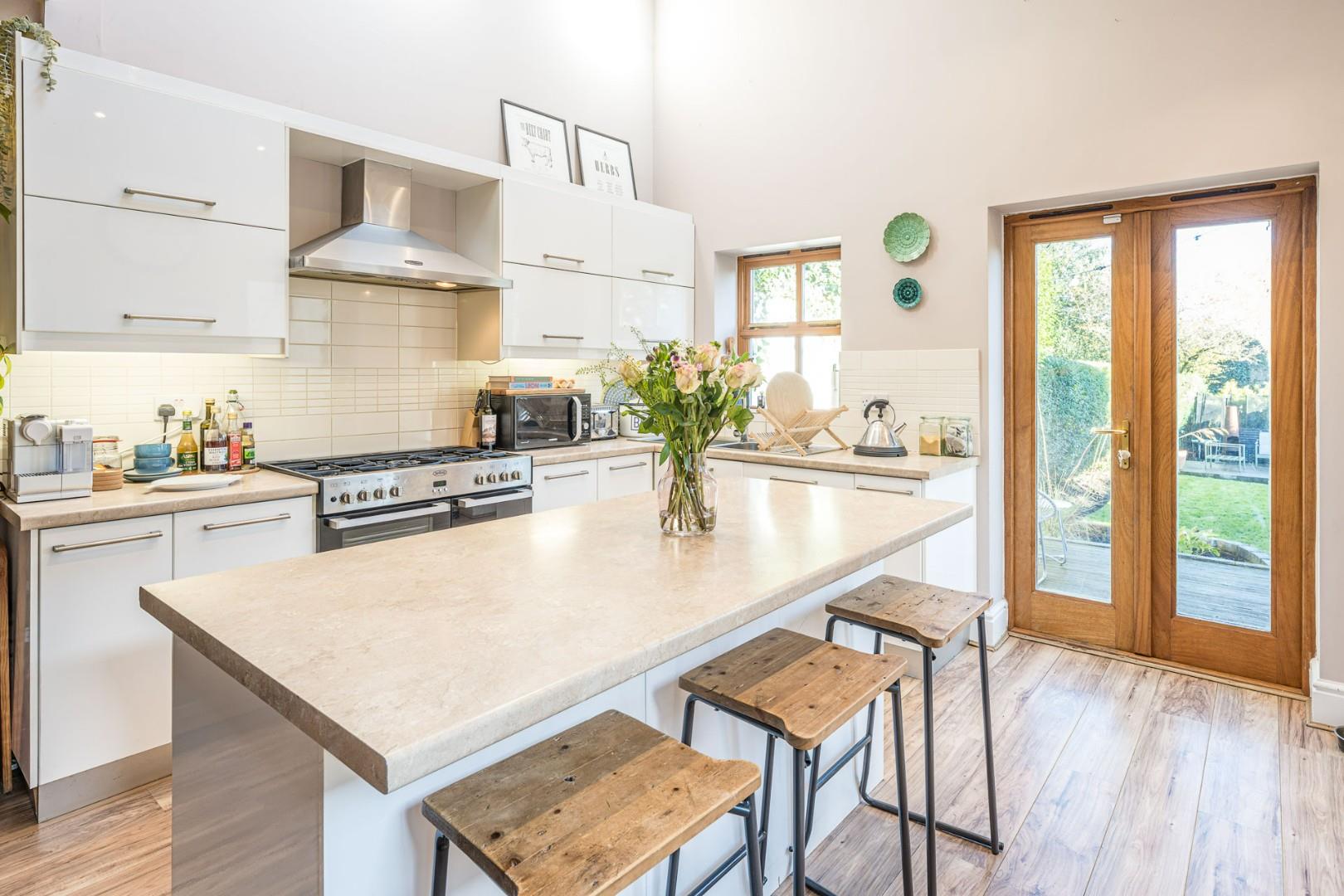 With a door leading from the entrance hall, fitted with a range of wall and base units with worktops, stainless steel sink with mixer tap and drainer, space for a range cooker with extractor hood above, integrated dishwasher, fridge and freezer, breakfast island with store cupboards, remote controlled skylight windows to the ceiling, double glazed windows to the rear and side, patio doors offering access to the garden and a central heating radiator
