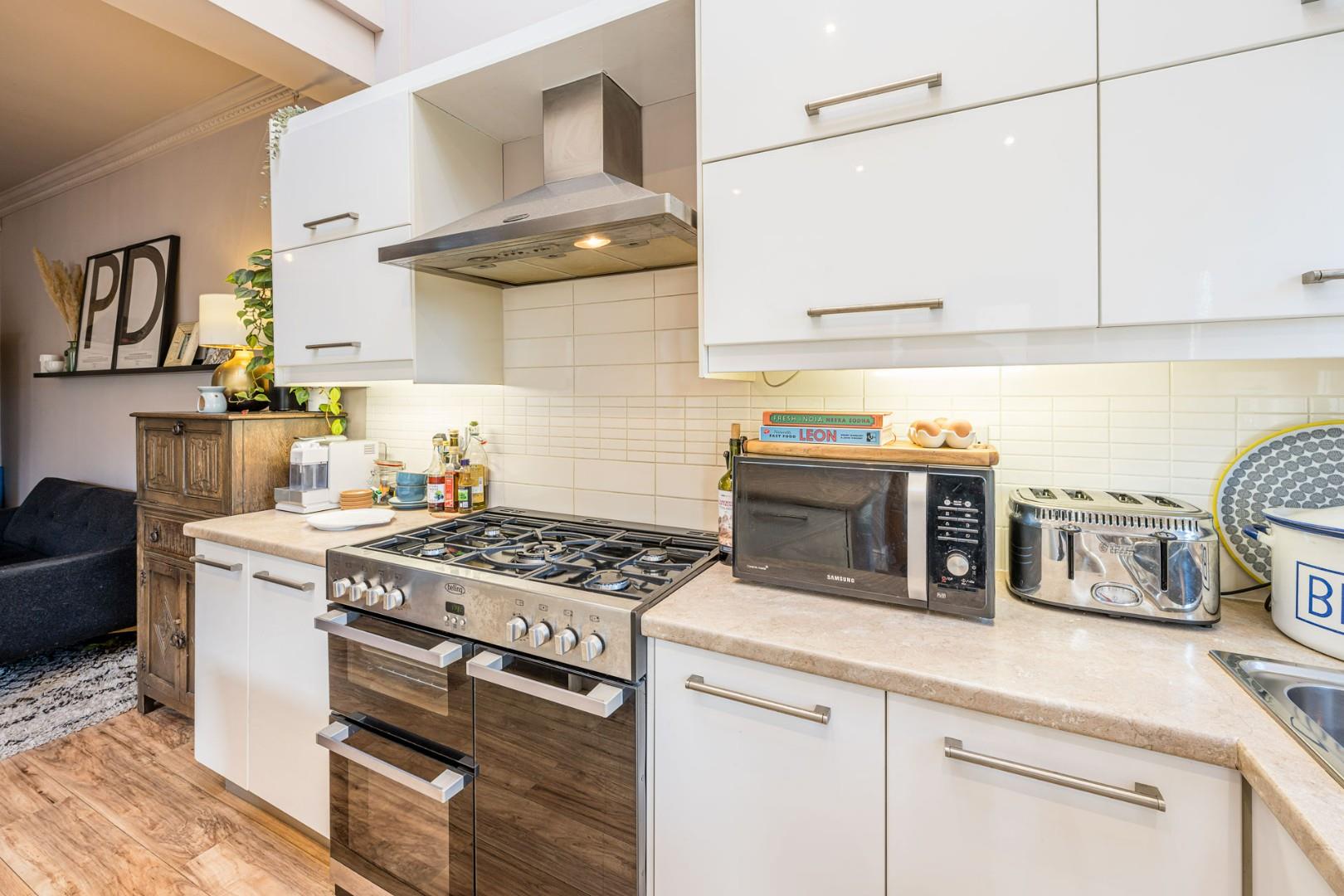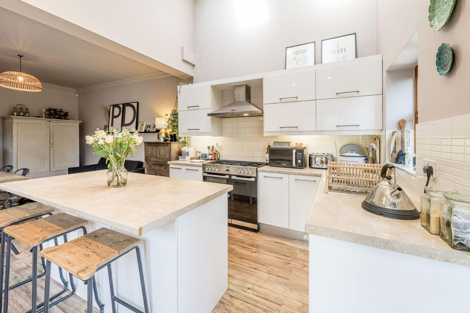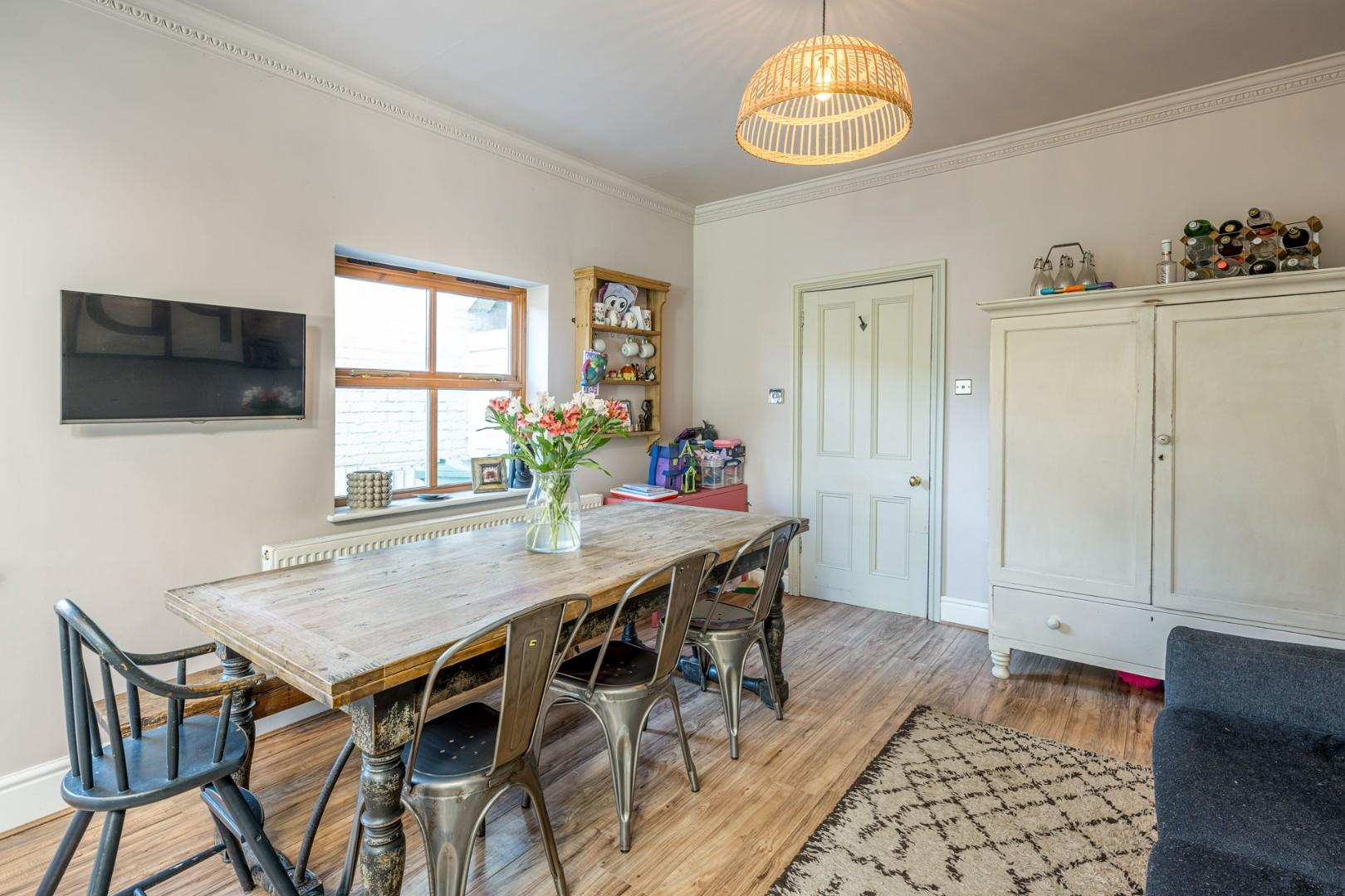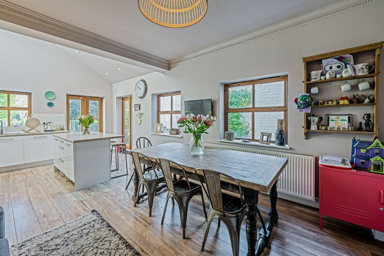 Located in the ever-popular village of Wollaston, this charming three-bedroom Victorian end-of-terrace home blends period character with modern touches. The ground floor welcomes you with a spacious hallway featuring a beautiful stained-glass side window, leading to a cosy lounge with open fireplace and bay window dressed with fitted shutter blinds. A handy utility cloakroom adds convenience, while the impressive open-plan kitchen/dining room boasts a vaulted ceiling and two remote-controlled skylights, creating a bright and airy hub for everyday living or entertaining.