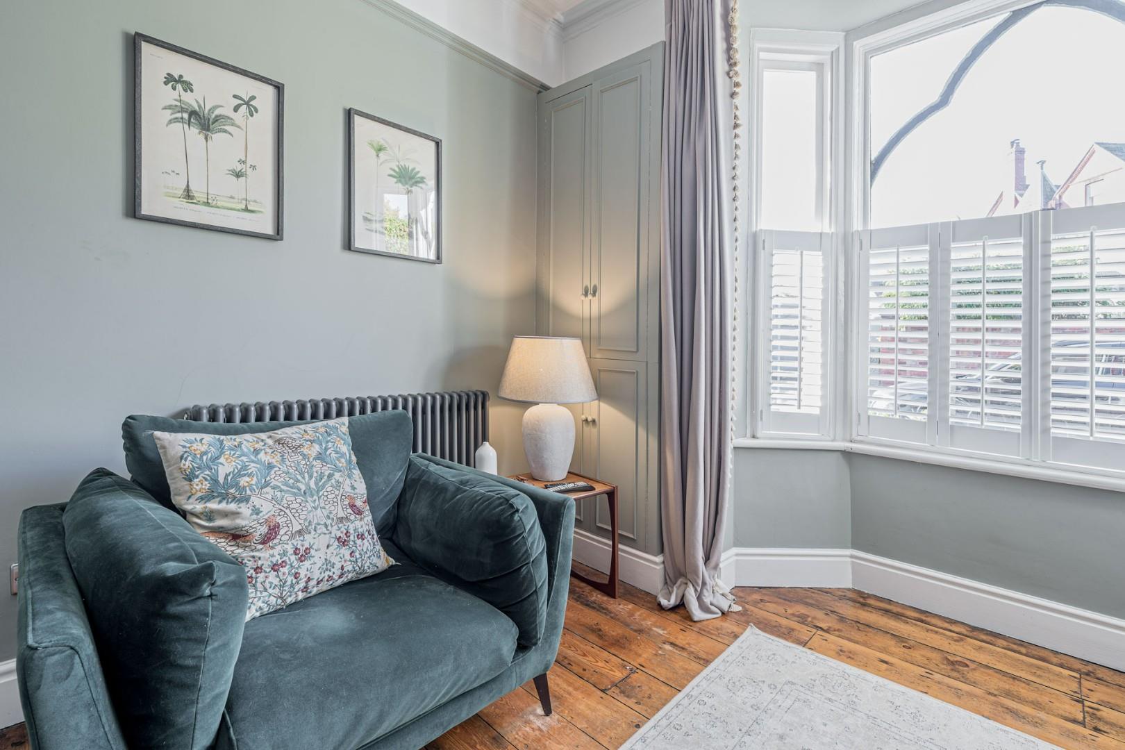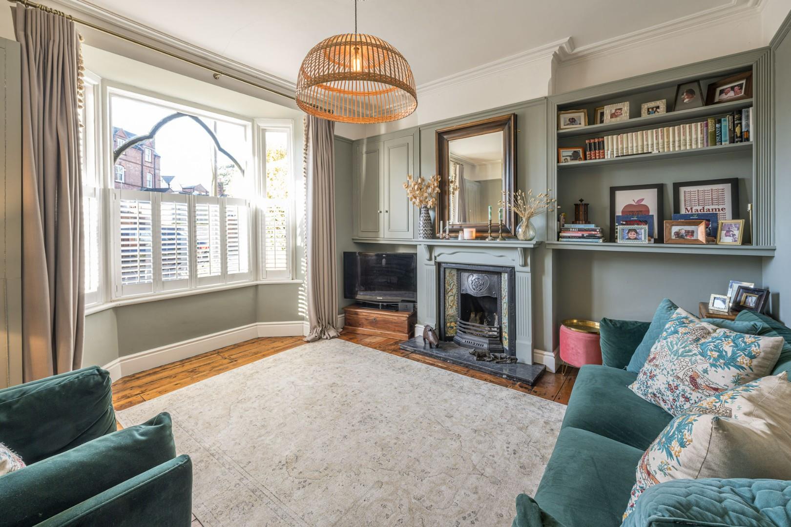 With a door leading from the entrance hall, open fire with decorative surround and hearth, bay window with fitted shutter blinds and a central heating radiator