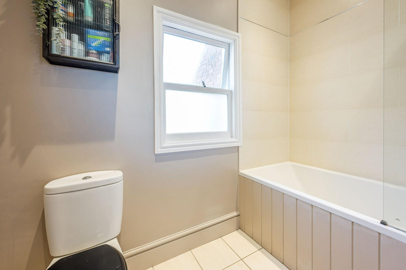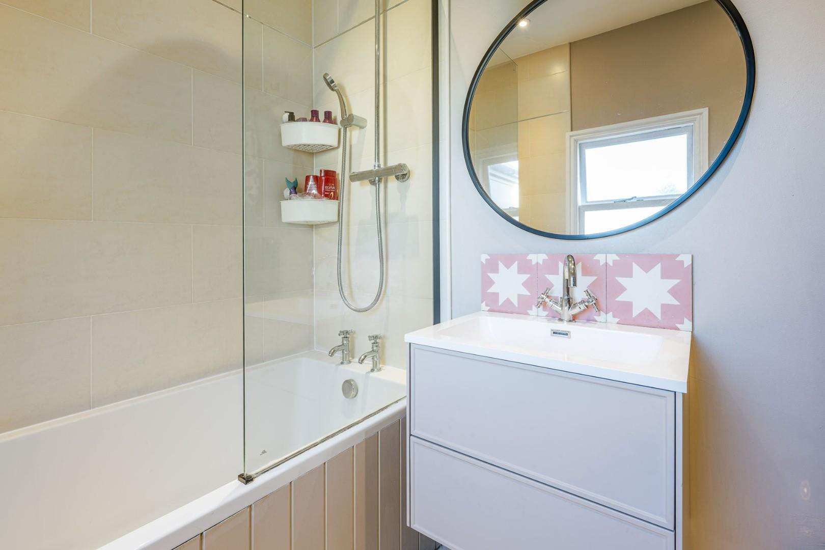 With a door leading from the landing, WC, hand wash basin, bath with shower over and full height tiled surround, double glazed window to the rear and a central heating radiator