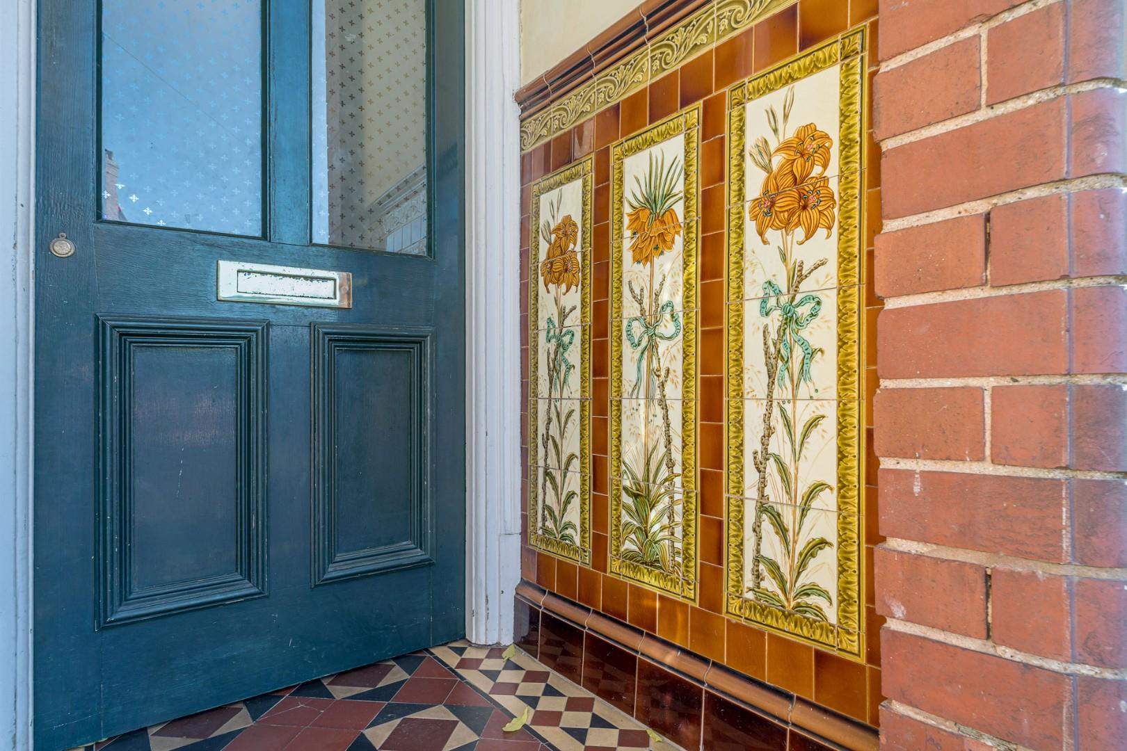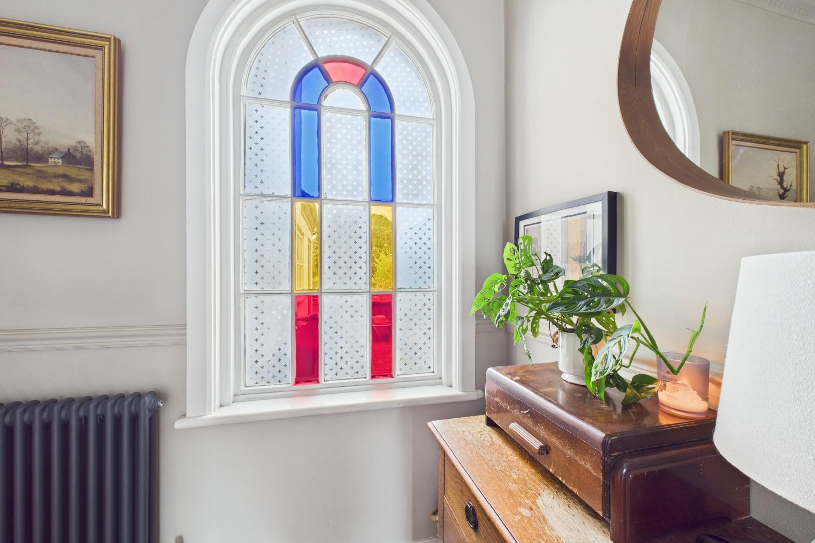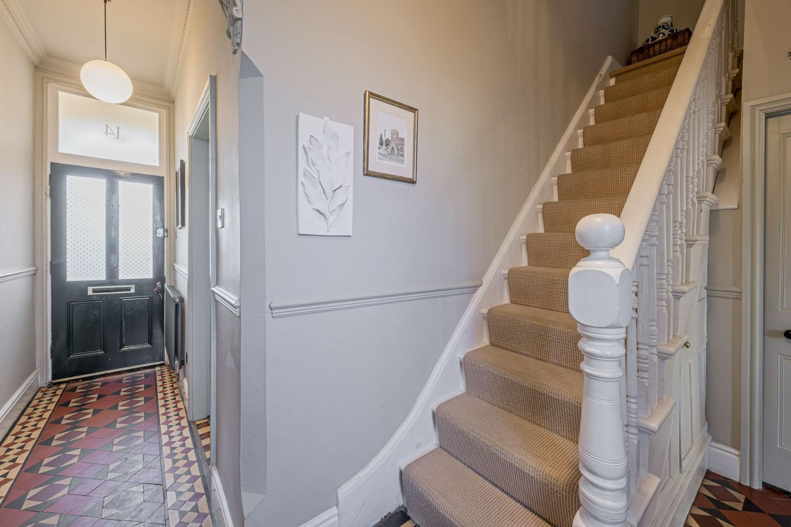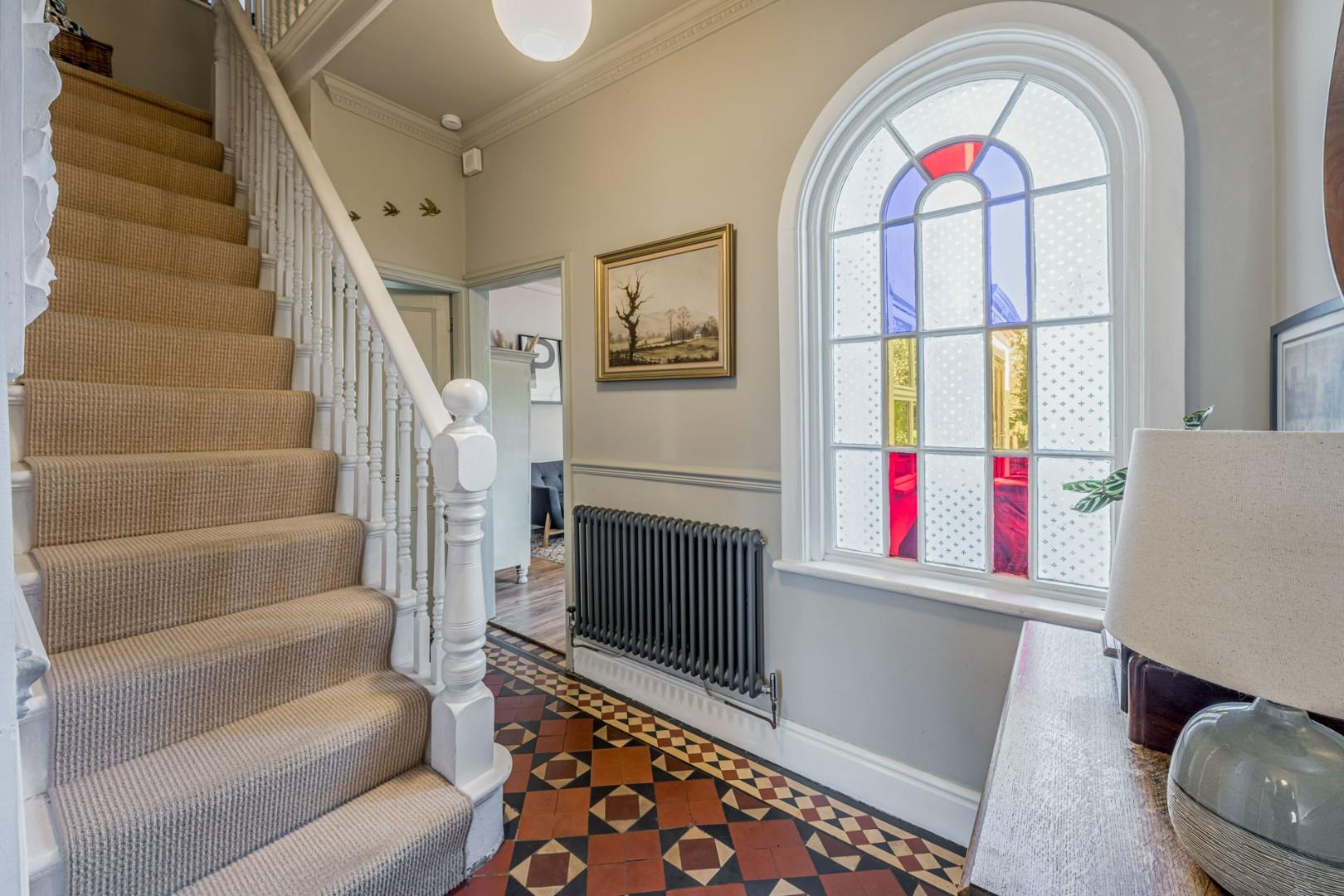With a door leading from the front, traditional 'Minton' style tiled flooring throughout, doors to various rooms, a stained glass window to the rear and a central heating radiator
