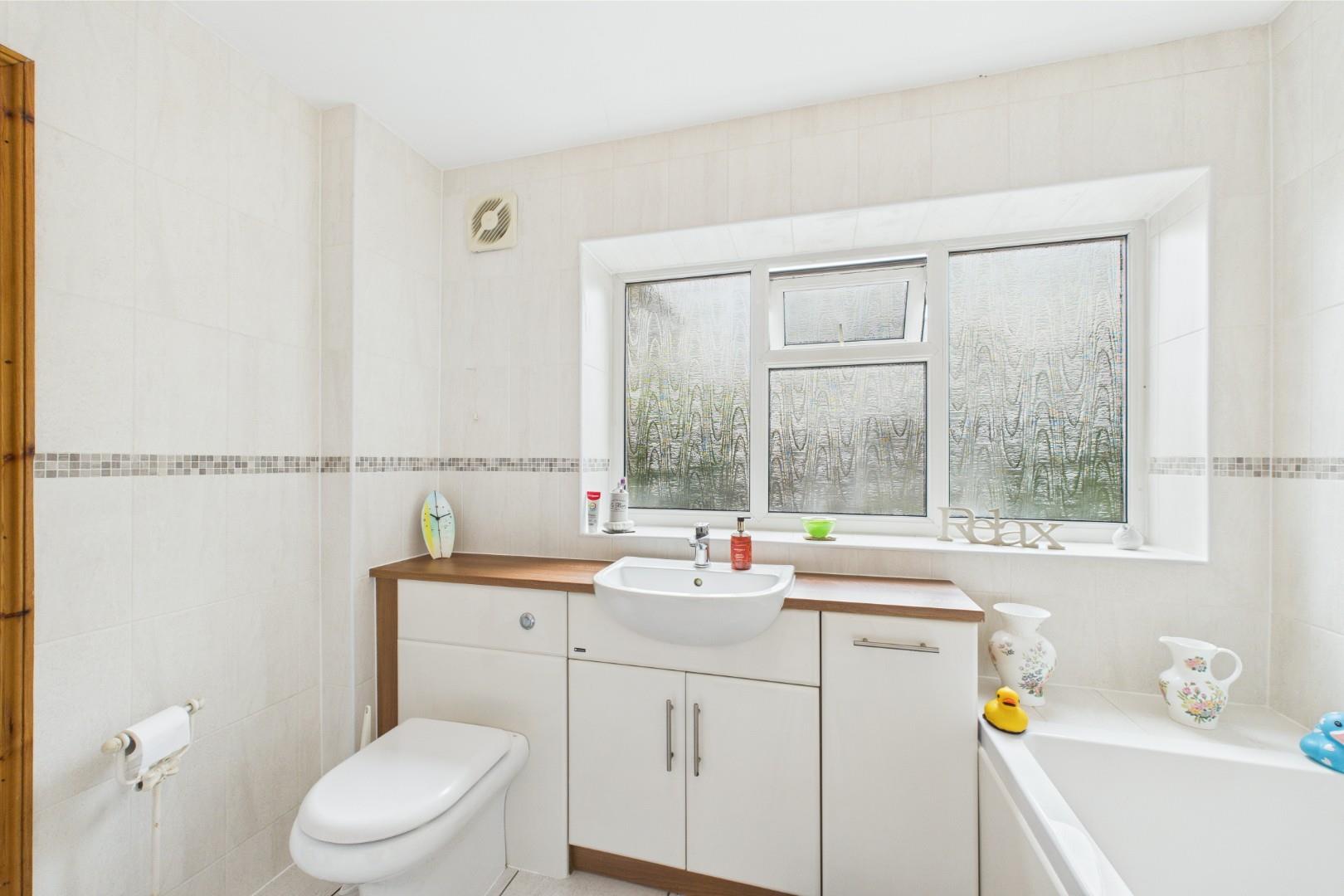 A double glazed window to the side elevation, a bath with a shower over, WC, wash hand basin, central heating radiator, fully tiled.