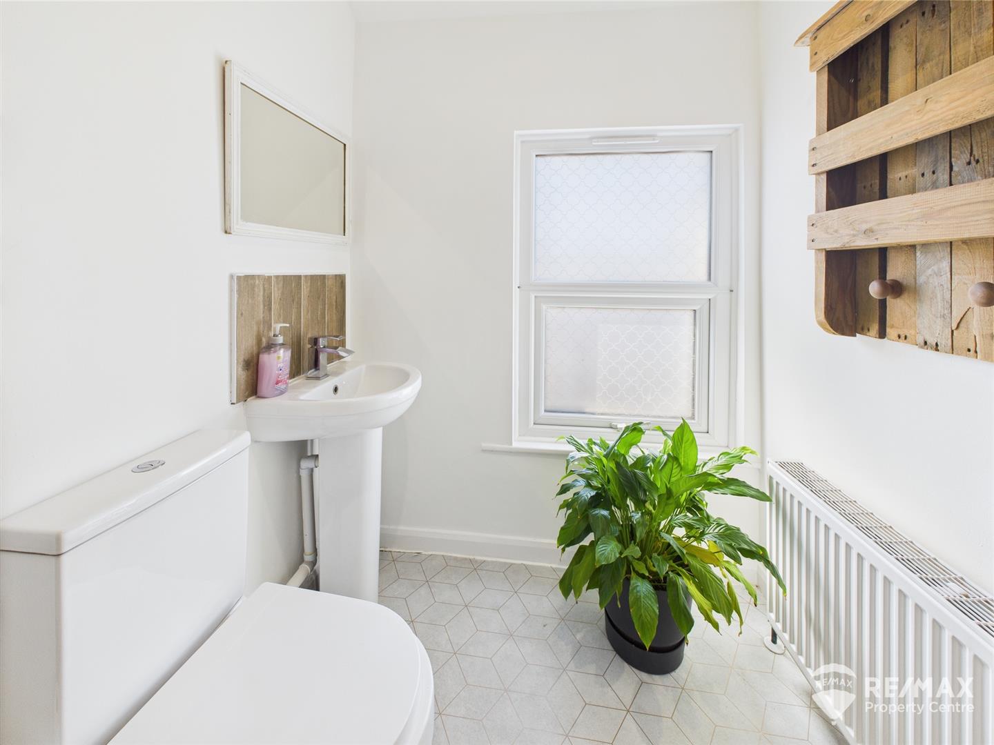 Suite comprising:- walk in shower, pedestal wash basin, low level WC and opaque window to front aspect