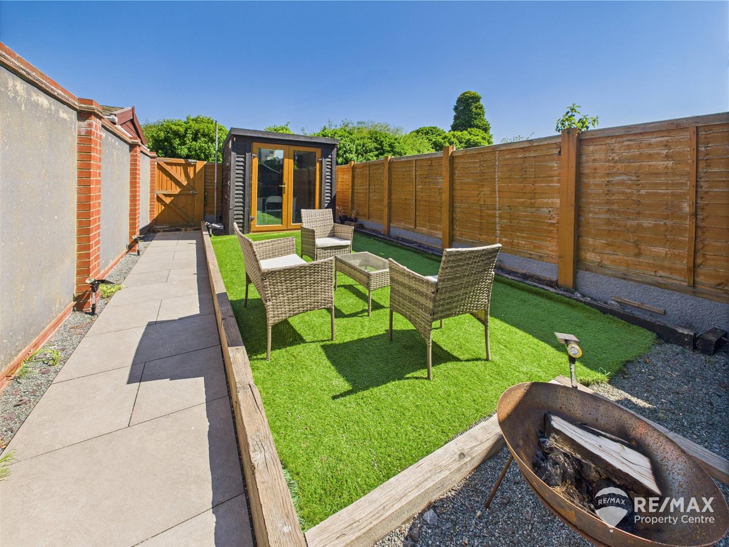 The landscaped rear garden is fully enclosed and provides rear access, laid to lawn with artificial grass contained by wooden sleepers, paved patio area, wooden storage shed plus a fully insulated detached garden room (power & light connected) currently used as a home office, outside tap and 2 weatherproof electric sockets, outdoor security lighting