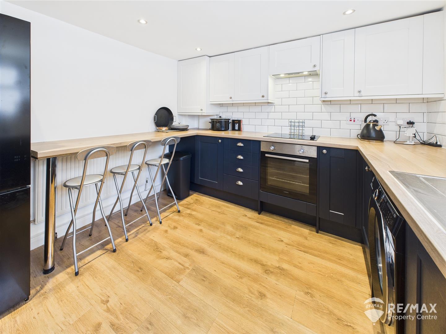 Newly fitted with a range of wall and base units, built in electric oven & hob with extractor, complimentary tiling, breakfast bar, stainless steel sink/drainer, spaces for washing machine & fridge freezer, integrated dishwasher, storage cupboard and window to front aspect