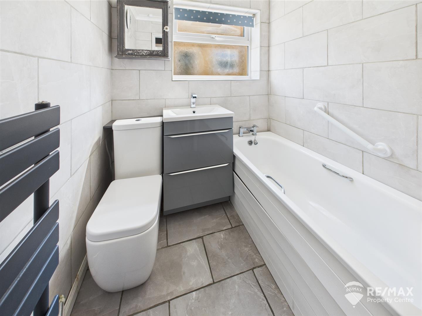 Suite comprising:- panelled bath, low level WC, wash basin in vanity unit, wall mounted towel radiator, fully tiled and opaque window to side aspect
