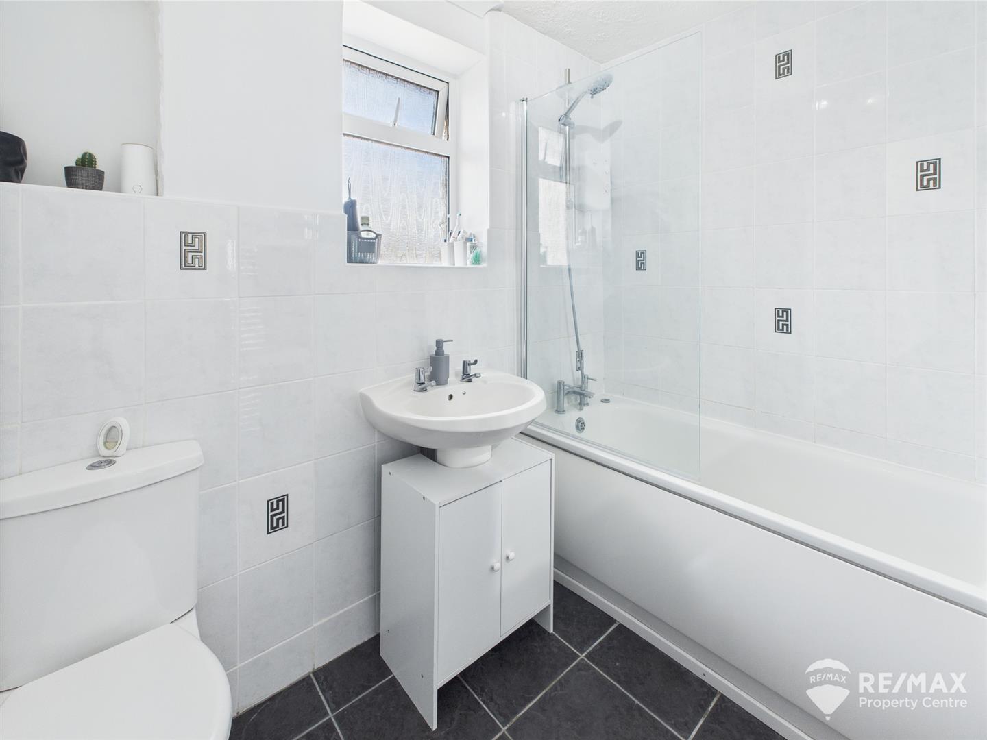 Suite comprising:- panelled bath with wall mounted shower & screen, part tiled walls, pedestal wash basin, low level WC, chrome wall mounted heated towel rail and opaque window to rear aspect