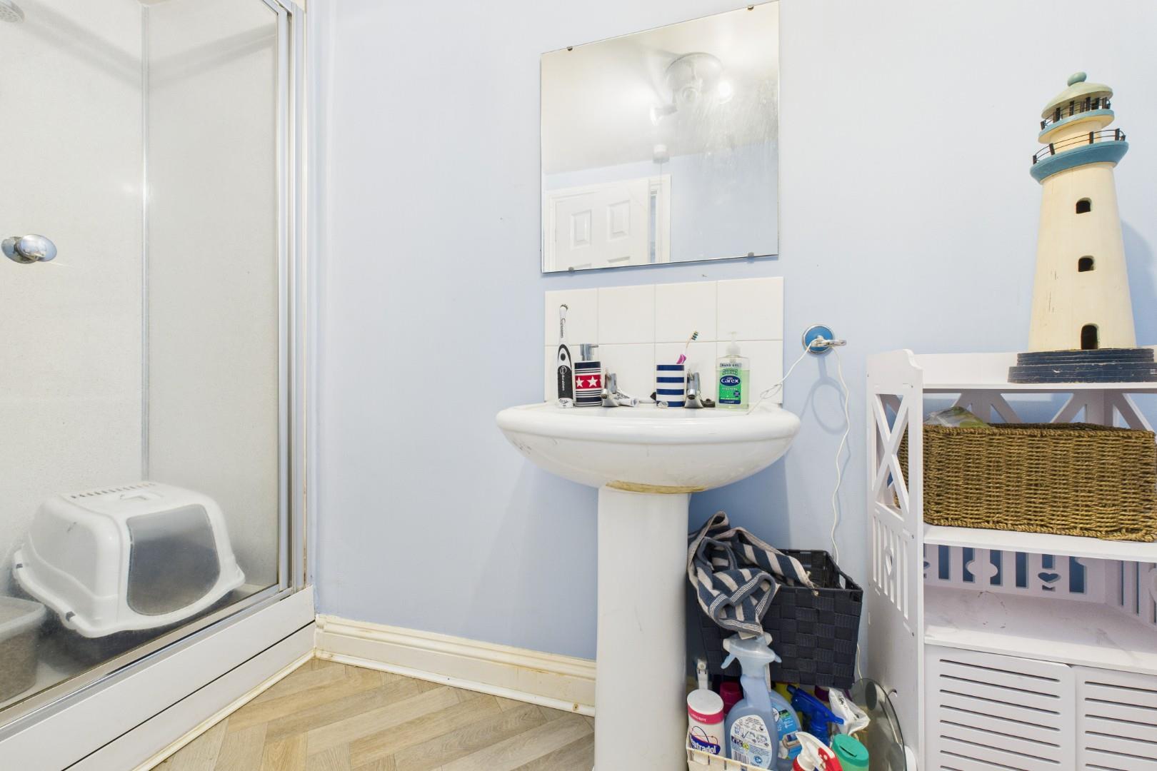 With a shower cubicle, wash hand basin, WC, central heating radiator and laminate flooring.
