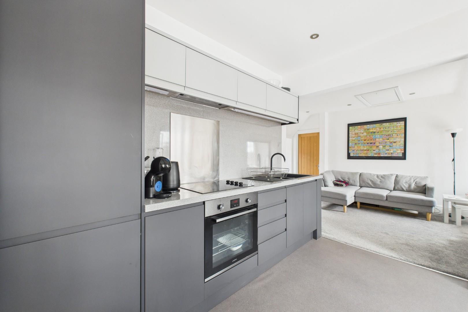 Upon entering the property, the good sized double bedroom is to your left, filled with natural light and offering a peaceful retreat. The hallway then leads into a spacious open-plan living area, finished in sleek grey and white tones for a clean, modern look. The lounge is a good size—ideal for relaxing or entertaining, with a cosy window seat and a view of the courtyard—and the adjoining kitchen area is equally spacious and well-equipped, featuring supplied white goods for added convenience.