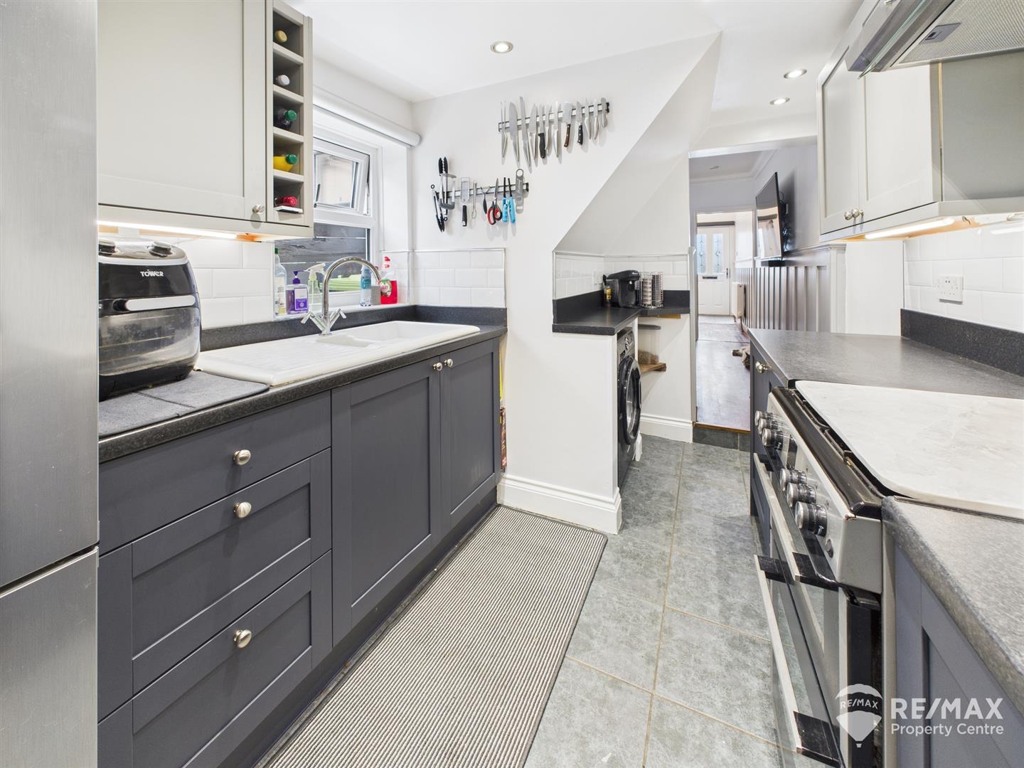 Fitted with a modern range of wall and base units, ceramic one and a half bowl sink and drainer, complimentary wall tiling, space for cooker (gas), extraction hood, spaces for fridge/freezer and washing machine, window to side aspect with fitted electric blind, leads to:-