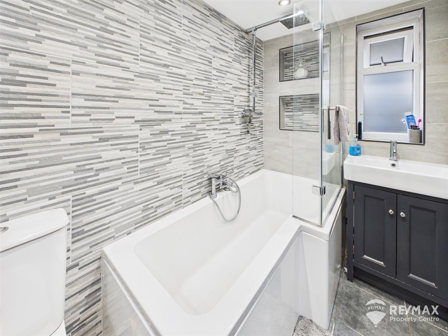 Suite comprising panelled 'P' bath with wall mounted shower and screen, sink in vanity unit, low level WC, heated towel radiator, fully tiled walls, extractor and opaque window to side aspect