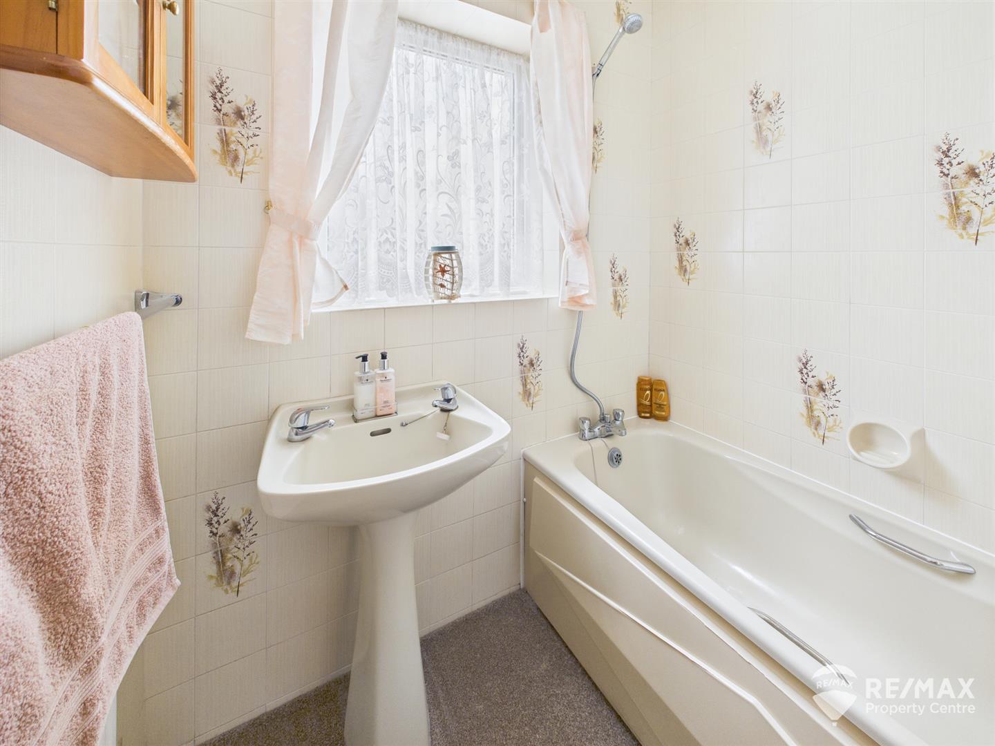 Suite comprising panelled bath with mixer taps and wall mounted shower attachment, pedestal wash basin, fully tiled walls and opaque window to rear aspect