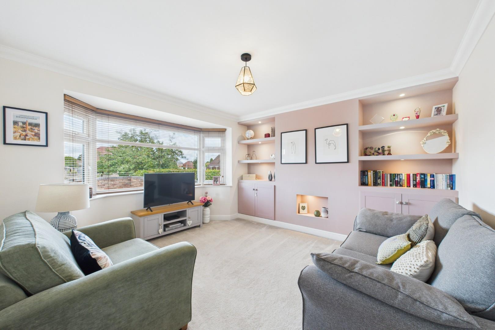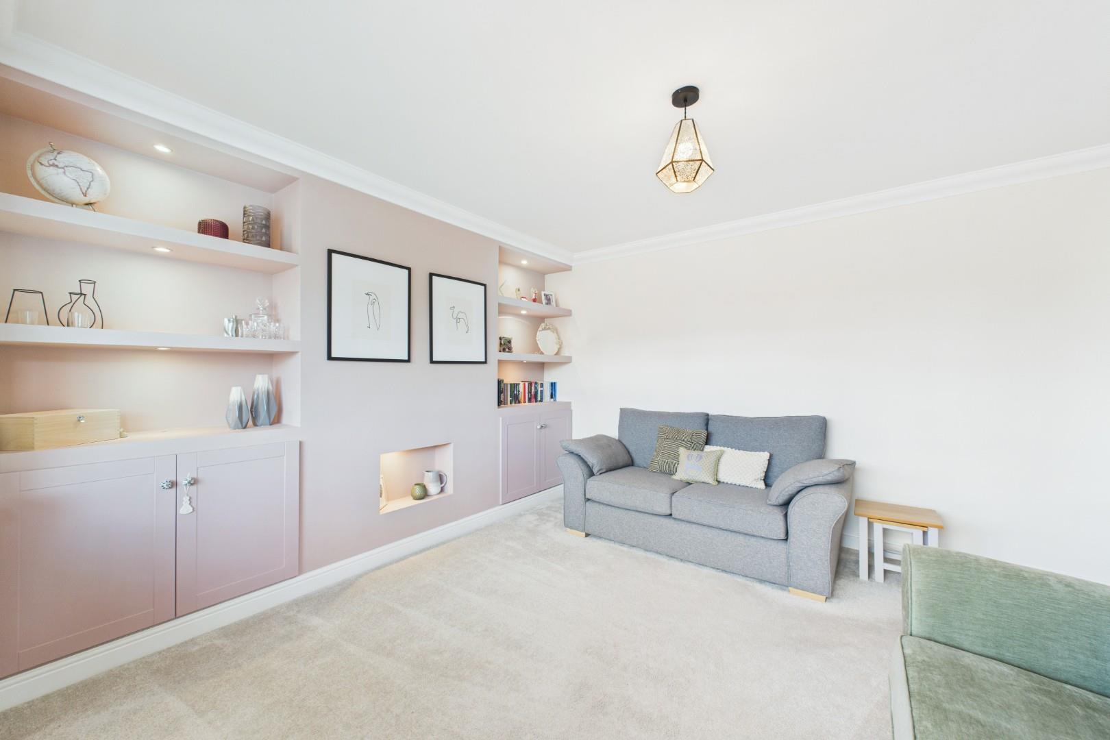 With a glazed door leading from the entrance hall, built-in alcove storage shelving with lighting, a double glazed window to the front and a central heating radiator