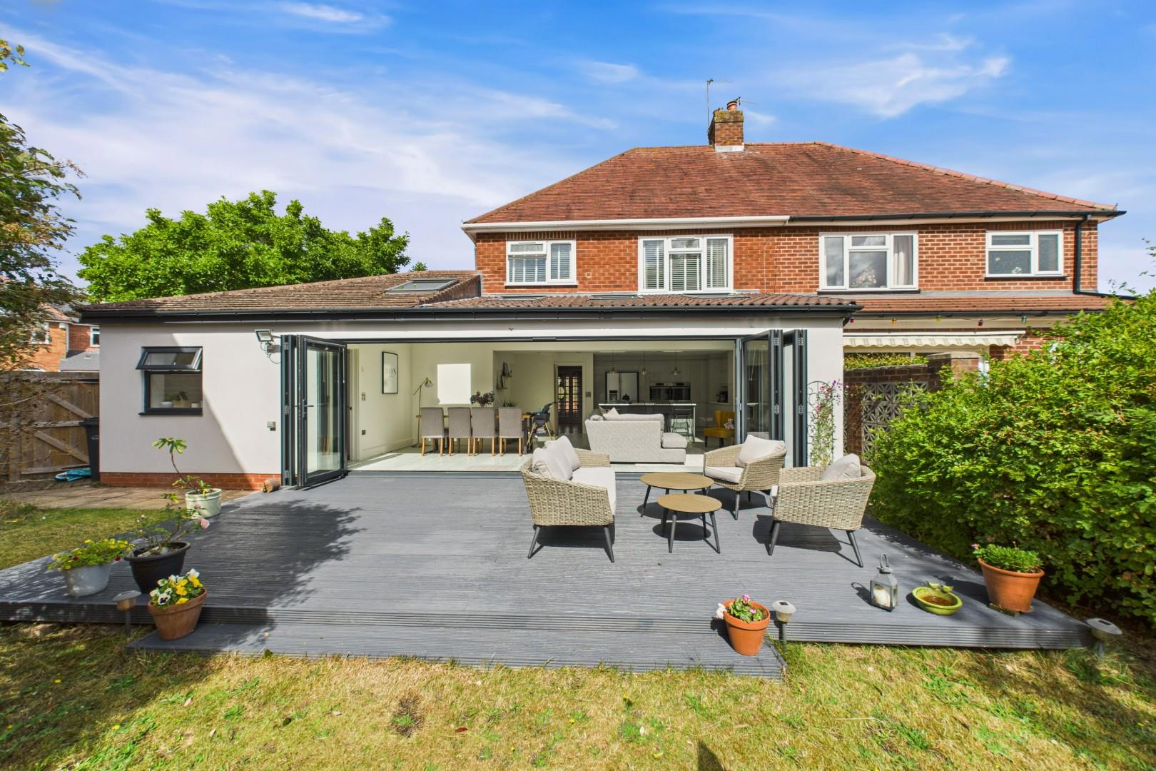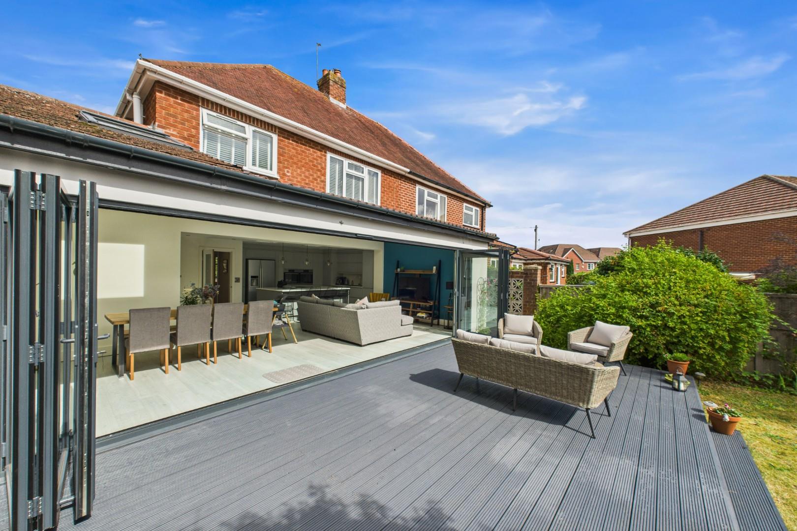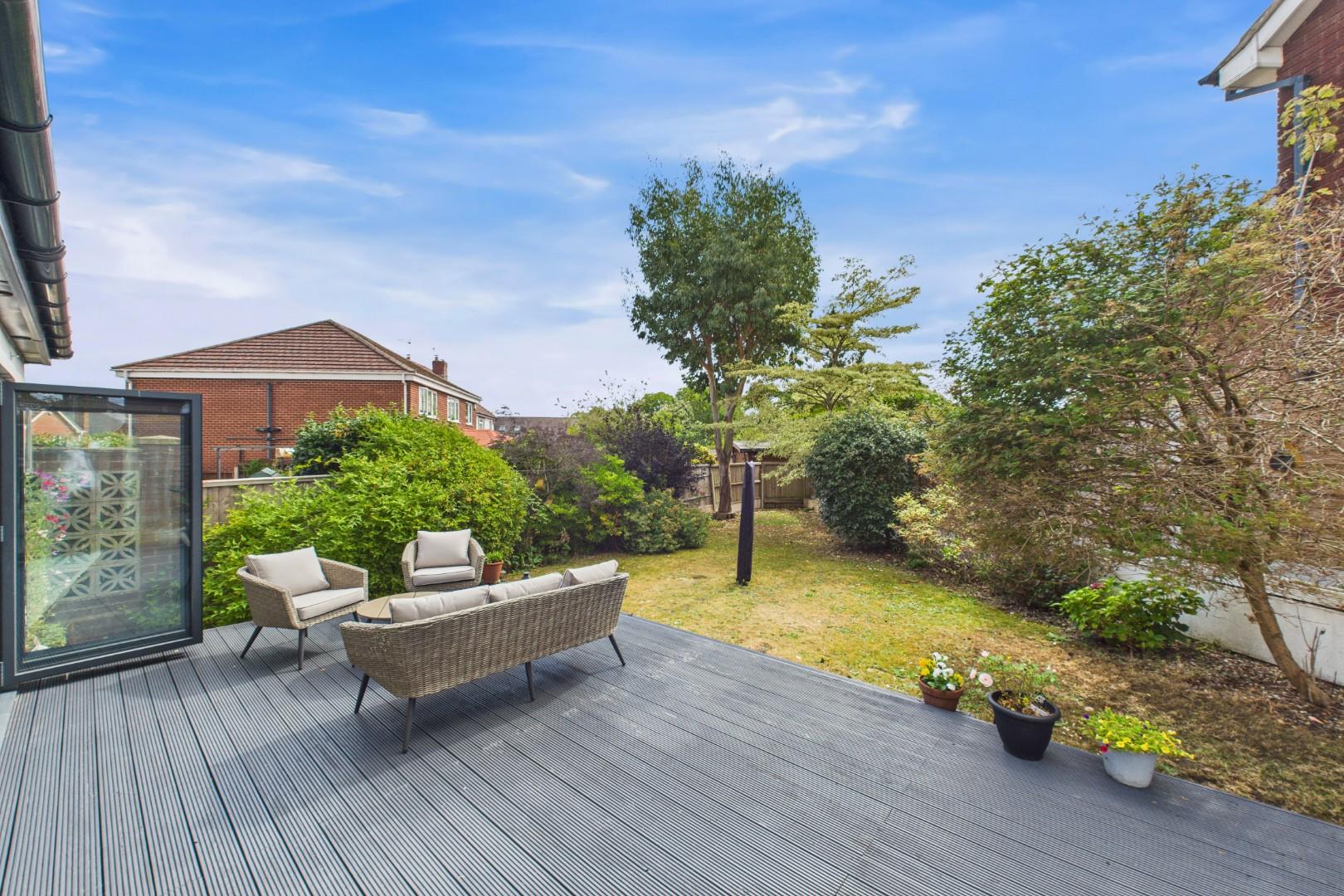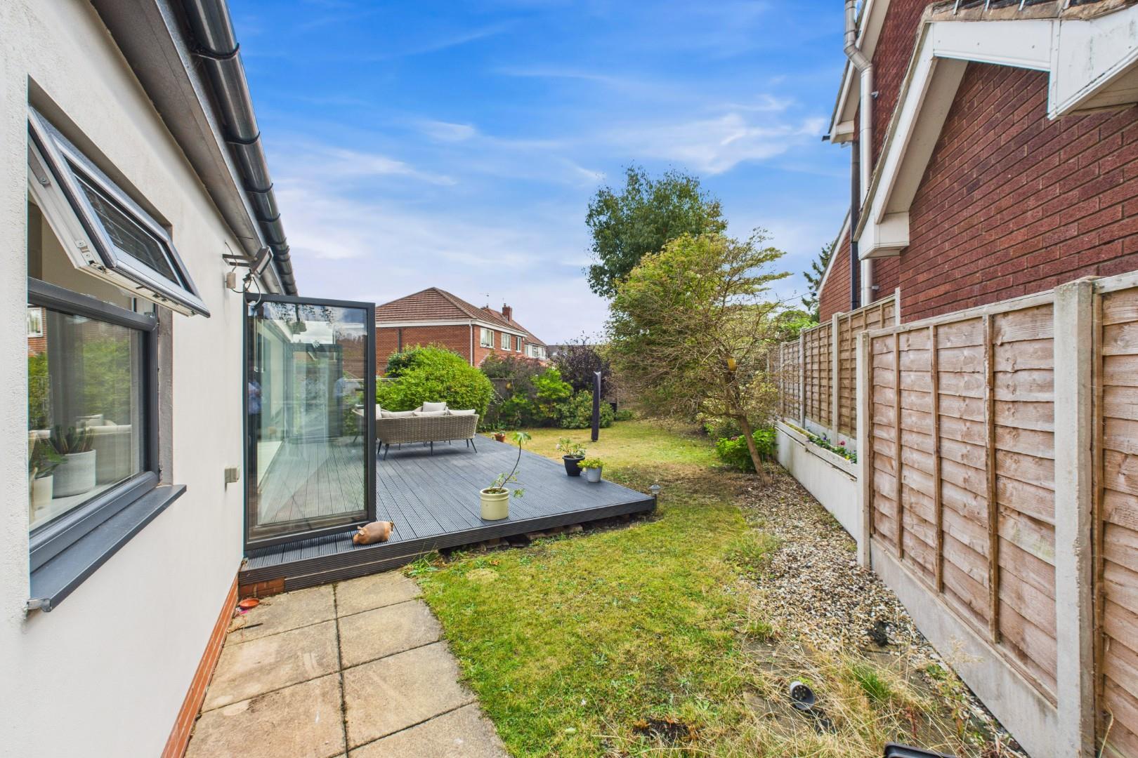 With bi-folding double glazed doors from the open plan kitchen lounge diner, deck to the front with lawn beyond mature shrub borders throughout, side access gate offering access to the driveway