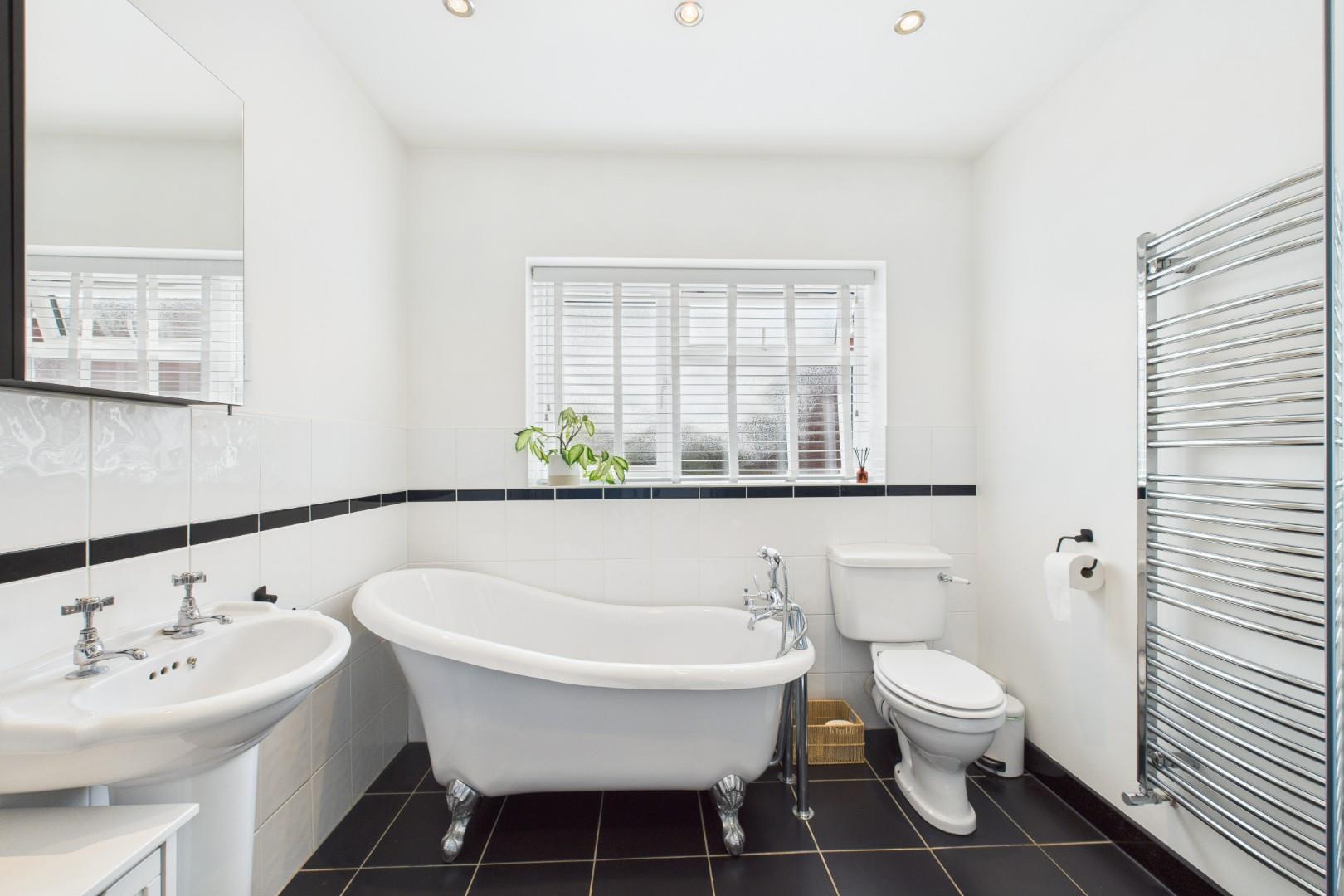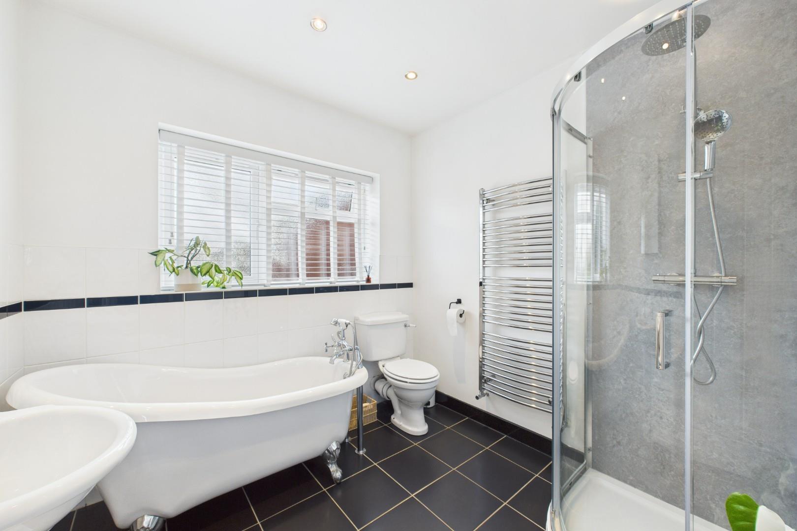 With a door leading from the landing, half height tile surround WC, hand wash basin, shower cubicle with glass screen, roll-top freestanding 'slipper' style bath, a double glazed window to the rear and a central heating radiator
