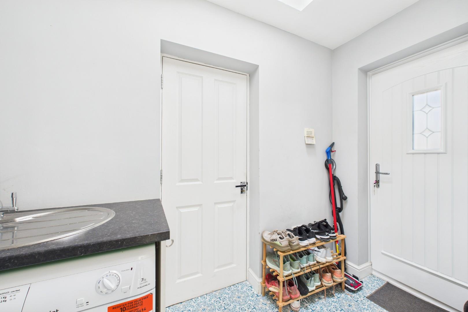 With a door leading from the open plan kitchen lounge diner, wall and base units with worktops, stainless steel sink with mixer tap and drainer, doors leading to the front and garage and a double glazed skylight window to the ceiling