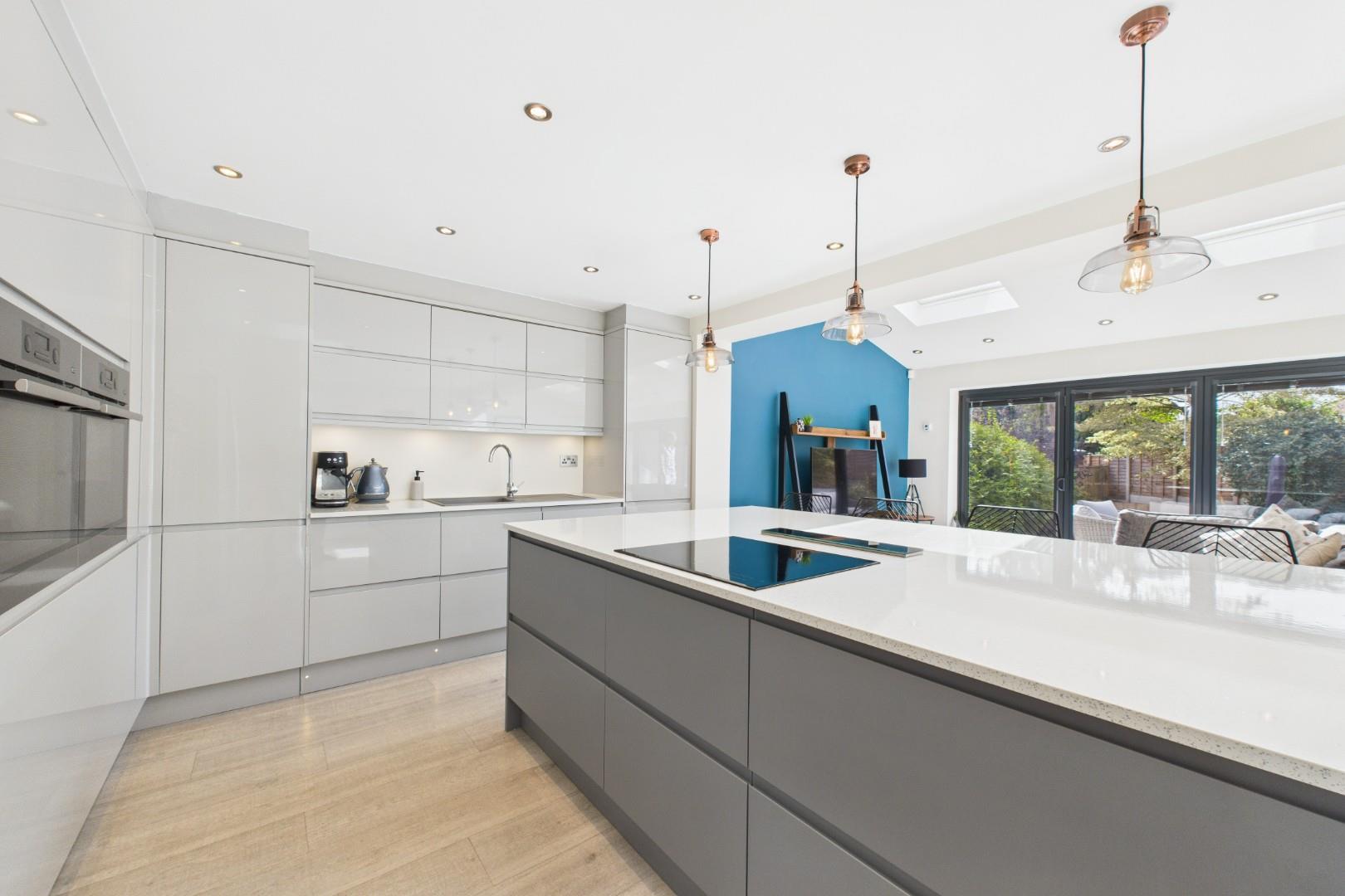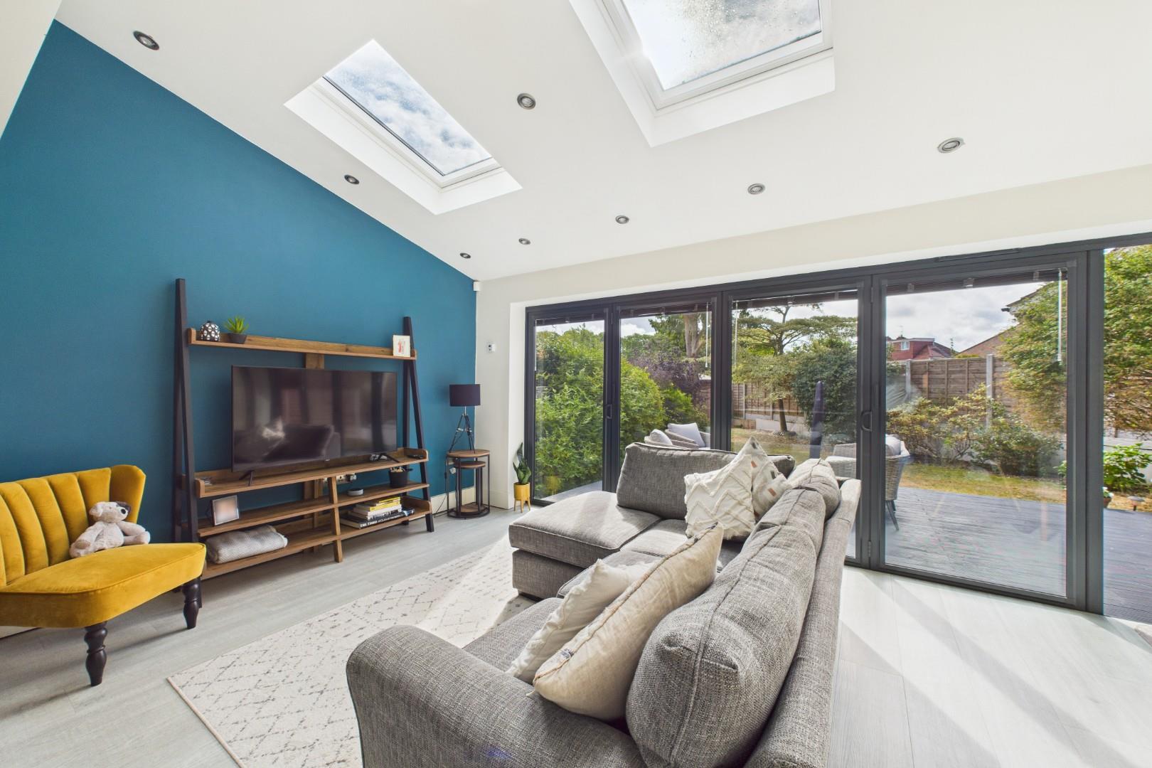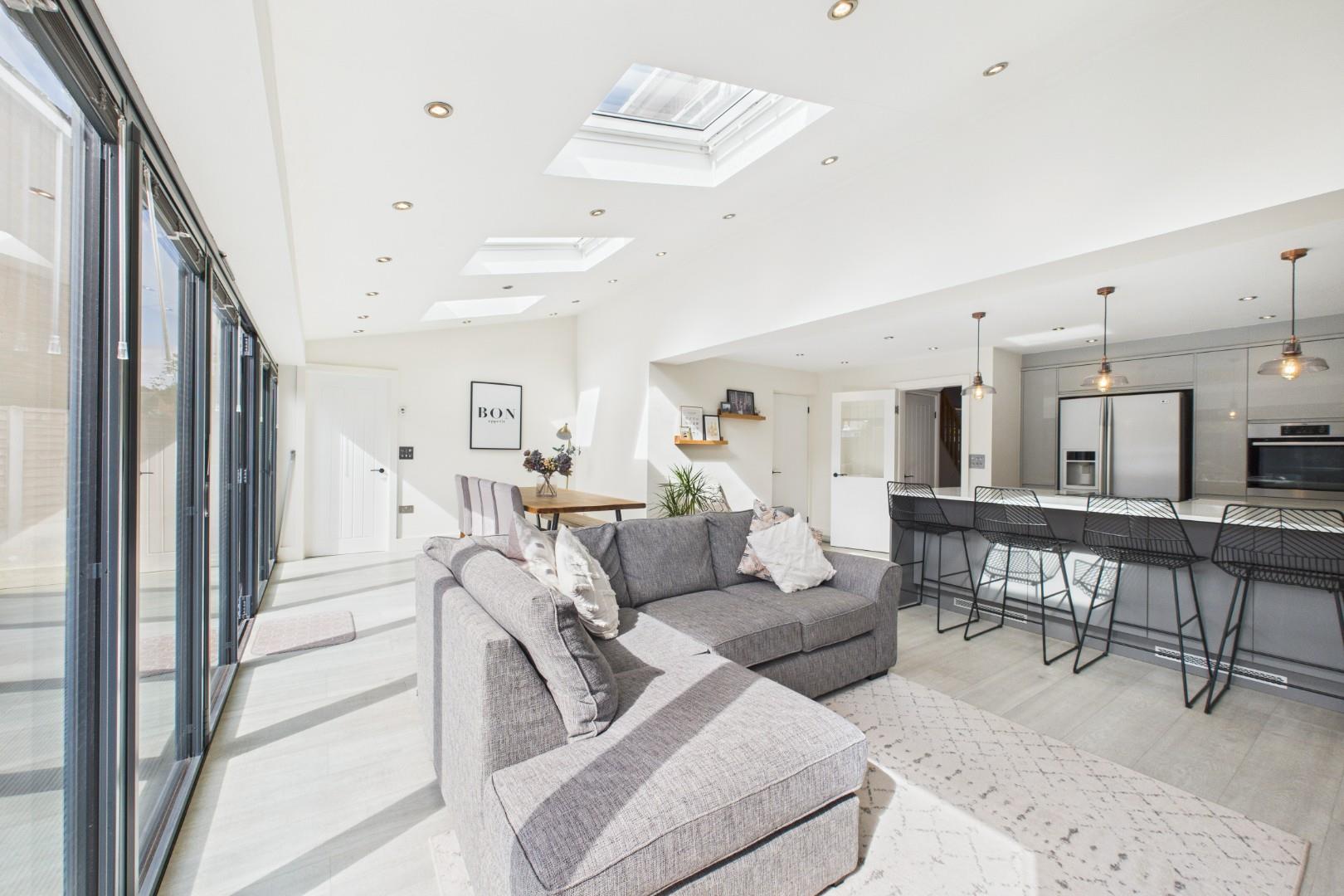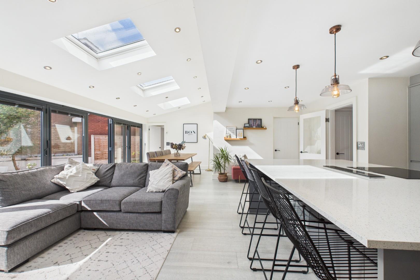 The open plan space has doors leading to the utility, office and WC, with skylight windows to the ceiling and bi-folding double glazed doors to the rear. This room benefits underfloor heating throughout