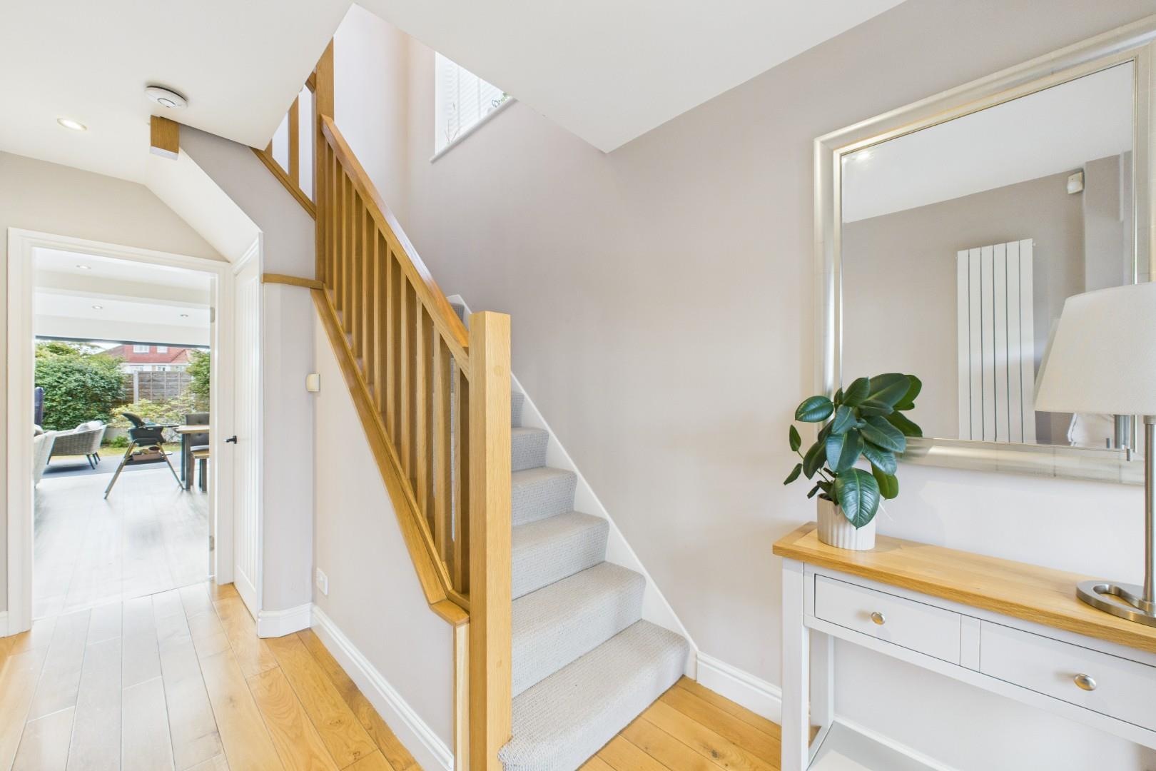With a stained glass feature door leading from the entrance porch, stairs leading to the first floor, doors to various rooms and under-stairs storage cupboard and a central heating radiator