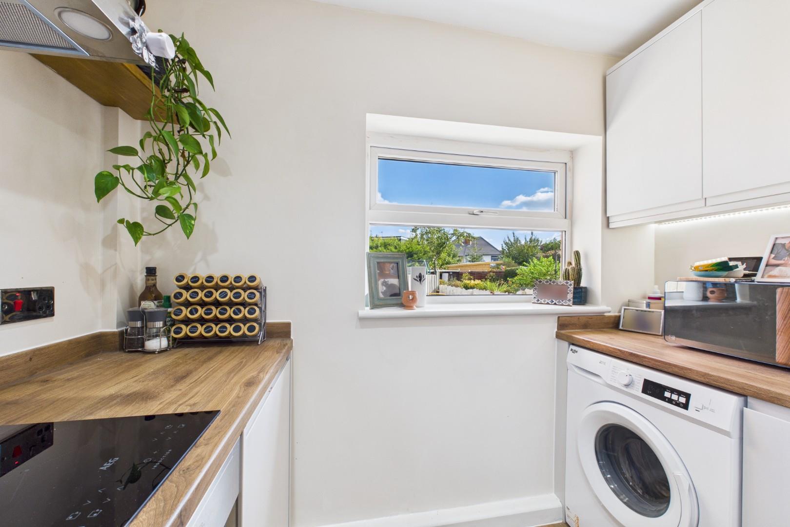 With an archway opening from the living room, recently fitted kitchen with a range of wall and base units with worktops, integrated appliances including oven, hob with extractor hood above, composite sink with mixer tap and double glazed windows to the side and rear