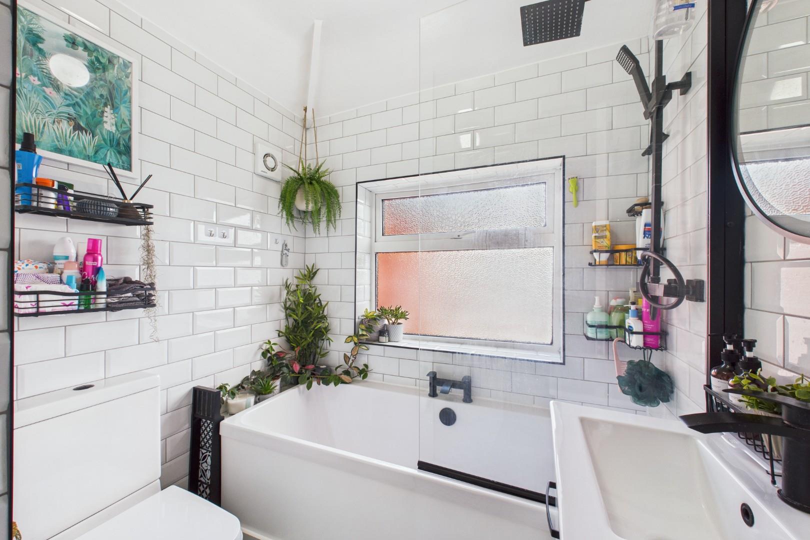 With a door leading from the landing, full height 'metro' style tile surround, WC, hand wash basin, bath with shower over and glass screen, a double glazed window to the rear and a central heating radiator