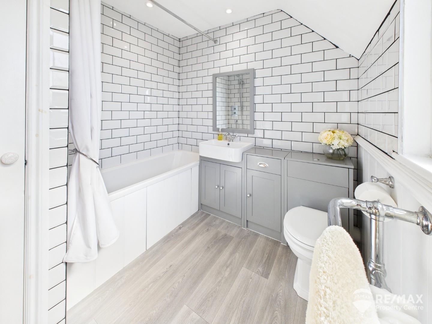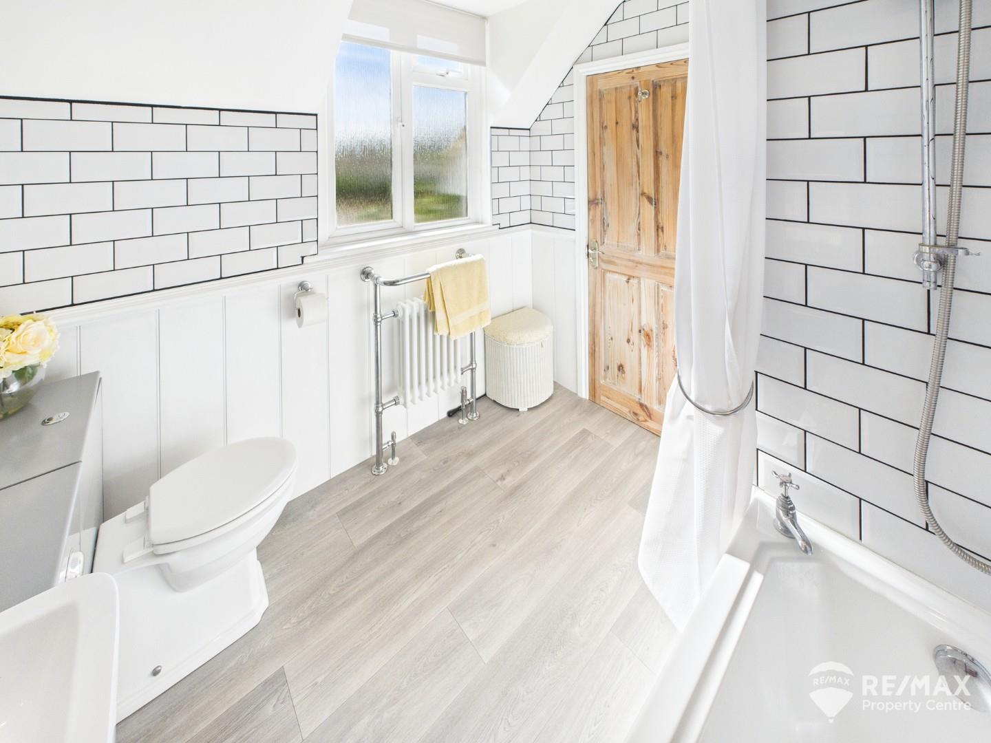 Opaque double glazed window to front aspect, tiled bathroom with panelled bath and wall mounted shower head with mixer taps, low level WC, basin and vanity unit, heated towel rail and storage cupboard.