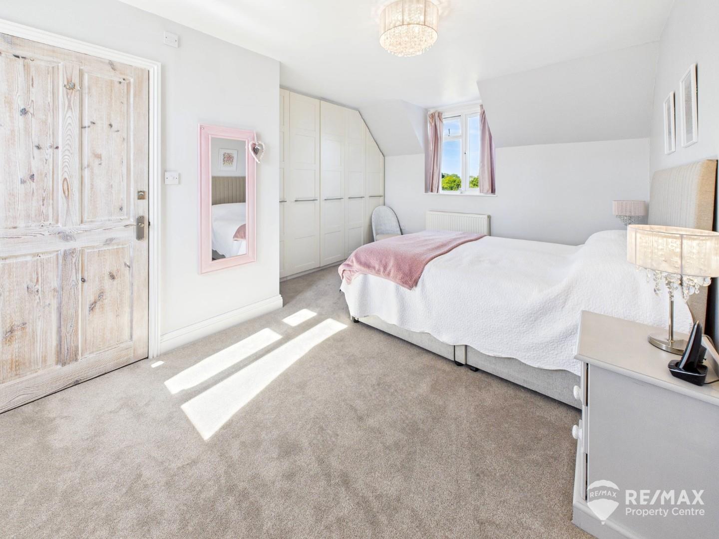 Double aspect windows to front and rear with garden and open field views, two radiators, fitted wardrobes and door to en-suite shower room.