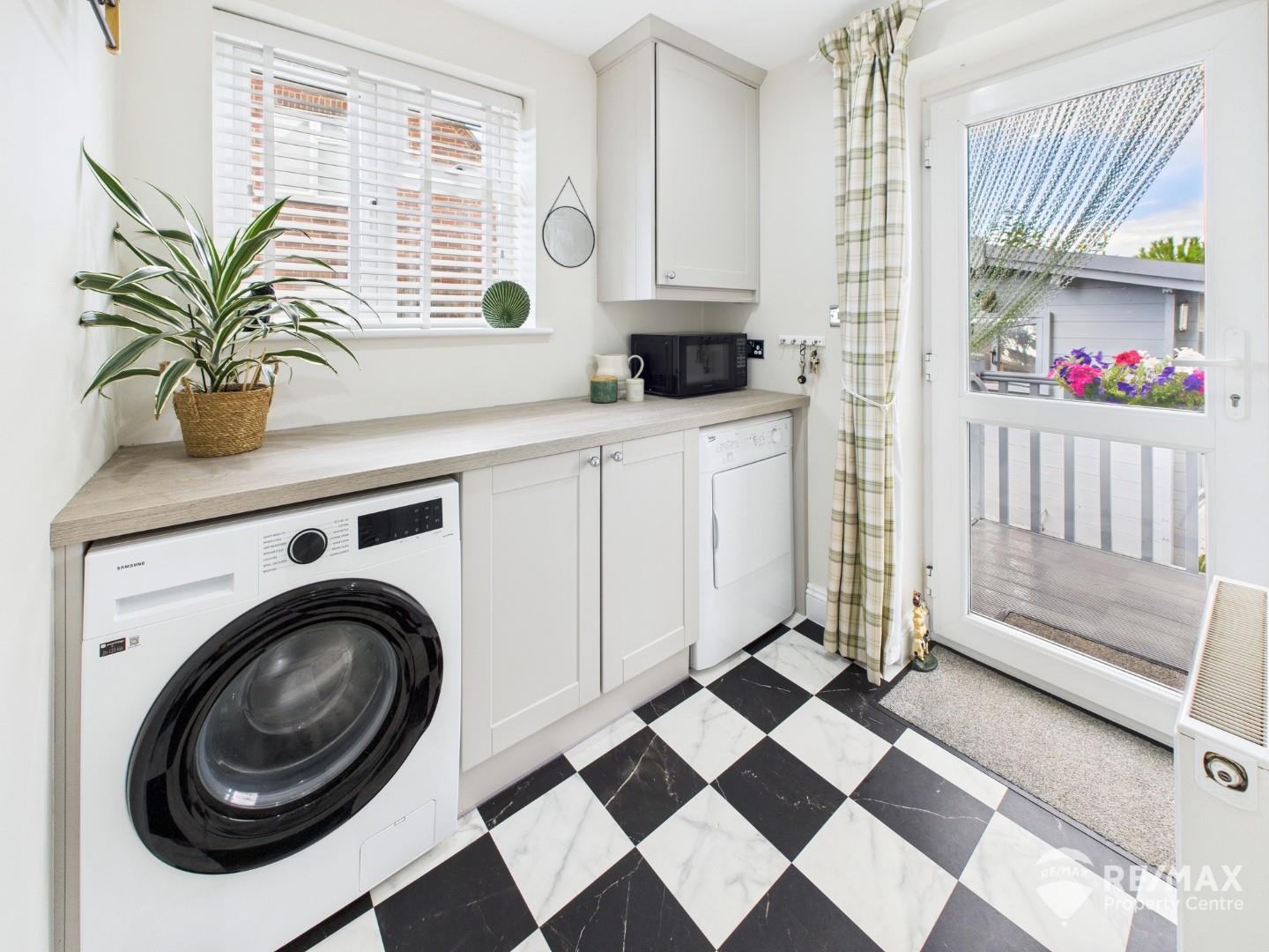 Window to side aspect, base level worktop with space for washing machine and tumble dryer, storage cupboard and eye level unit/cupboard. Radiator and back door leading to rear garden areas.