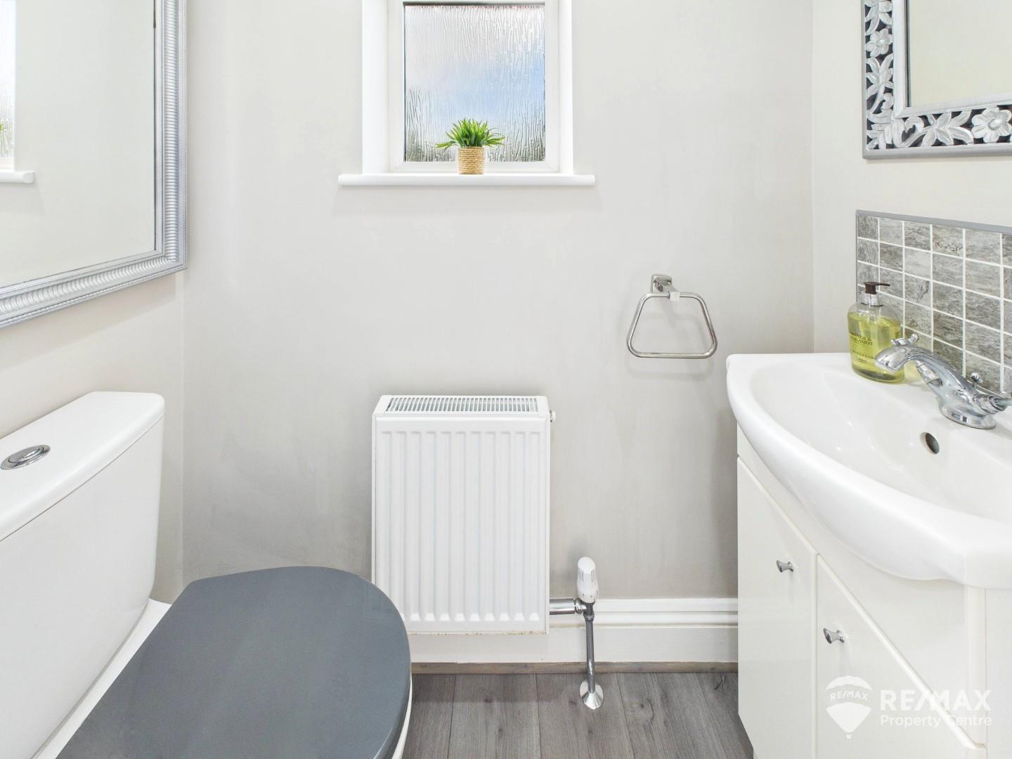 Opaque double glazed window to front, low level WC, hand wash basin and vanity unit with part tiled splash back, radiator.