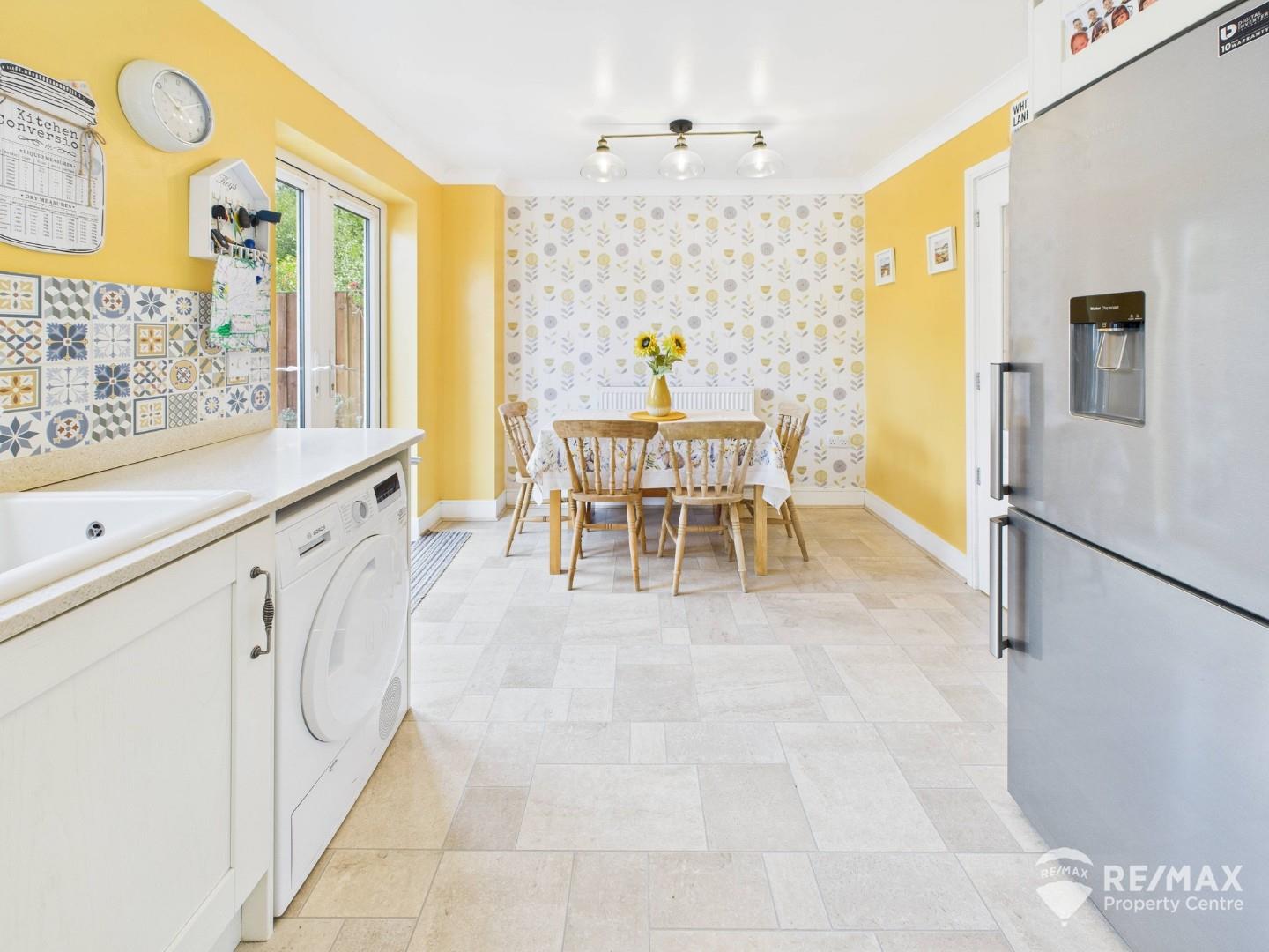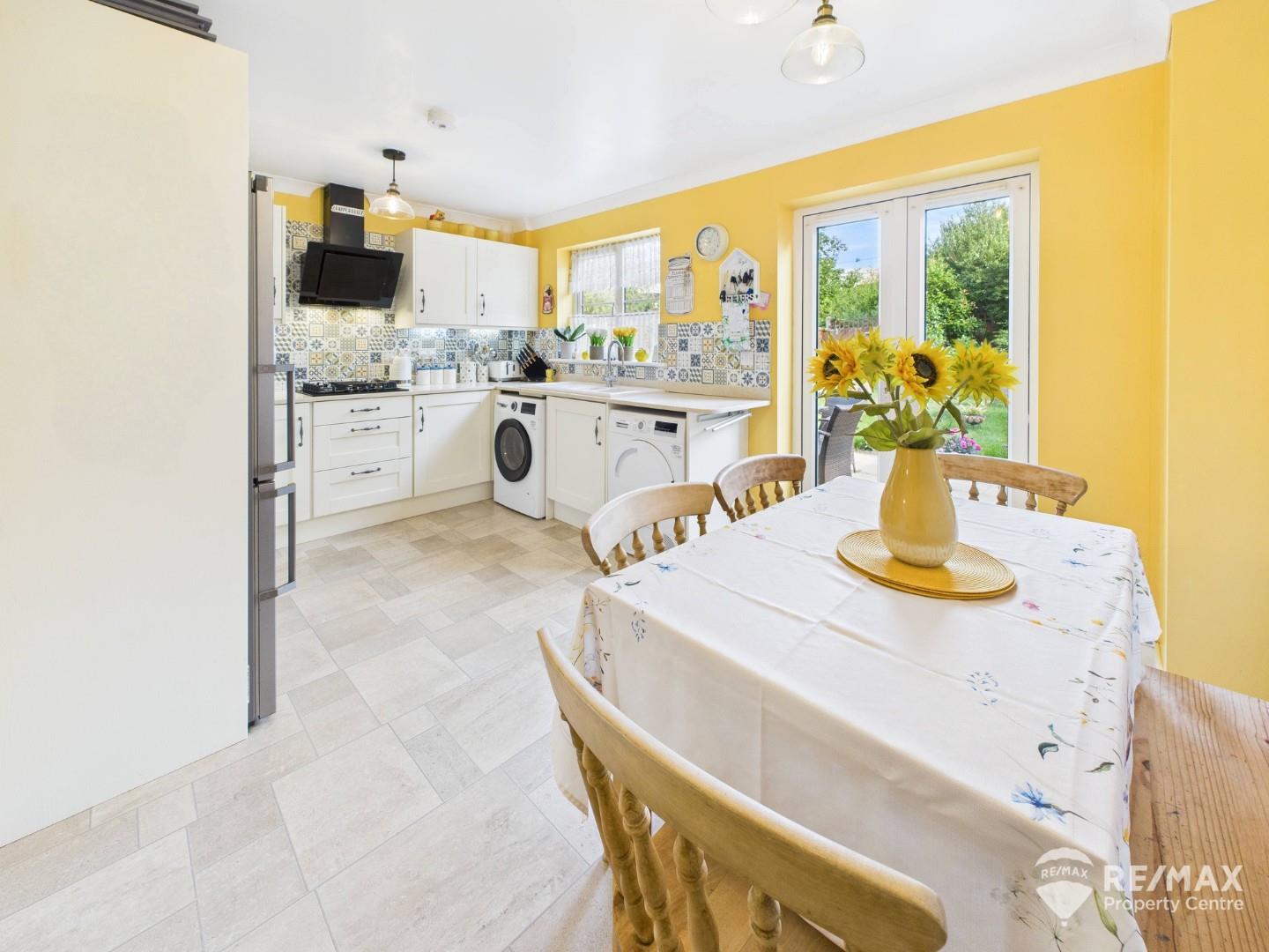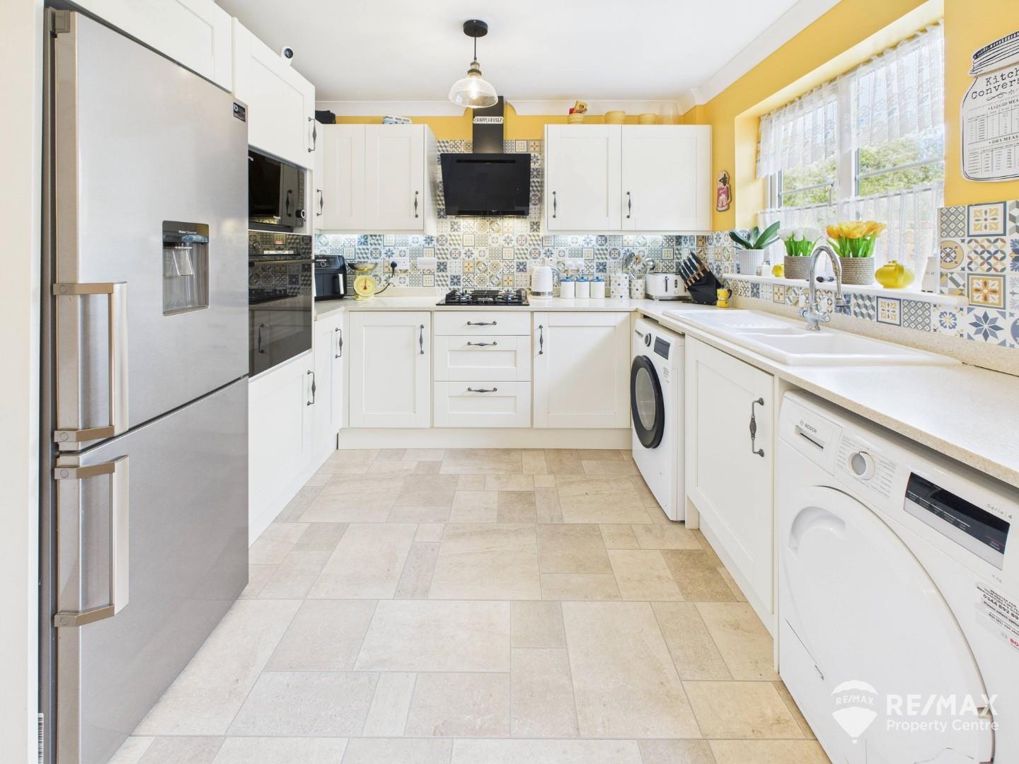 Base and eye level units with built in electric oven, gas hob, extractor, spaces for fridge/freezer, washing machine and dishwasher, window to rear aspect and French doors opening onto patio and garden area.