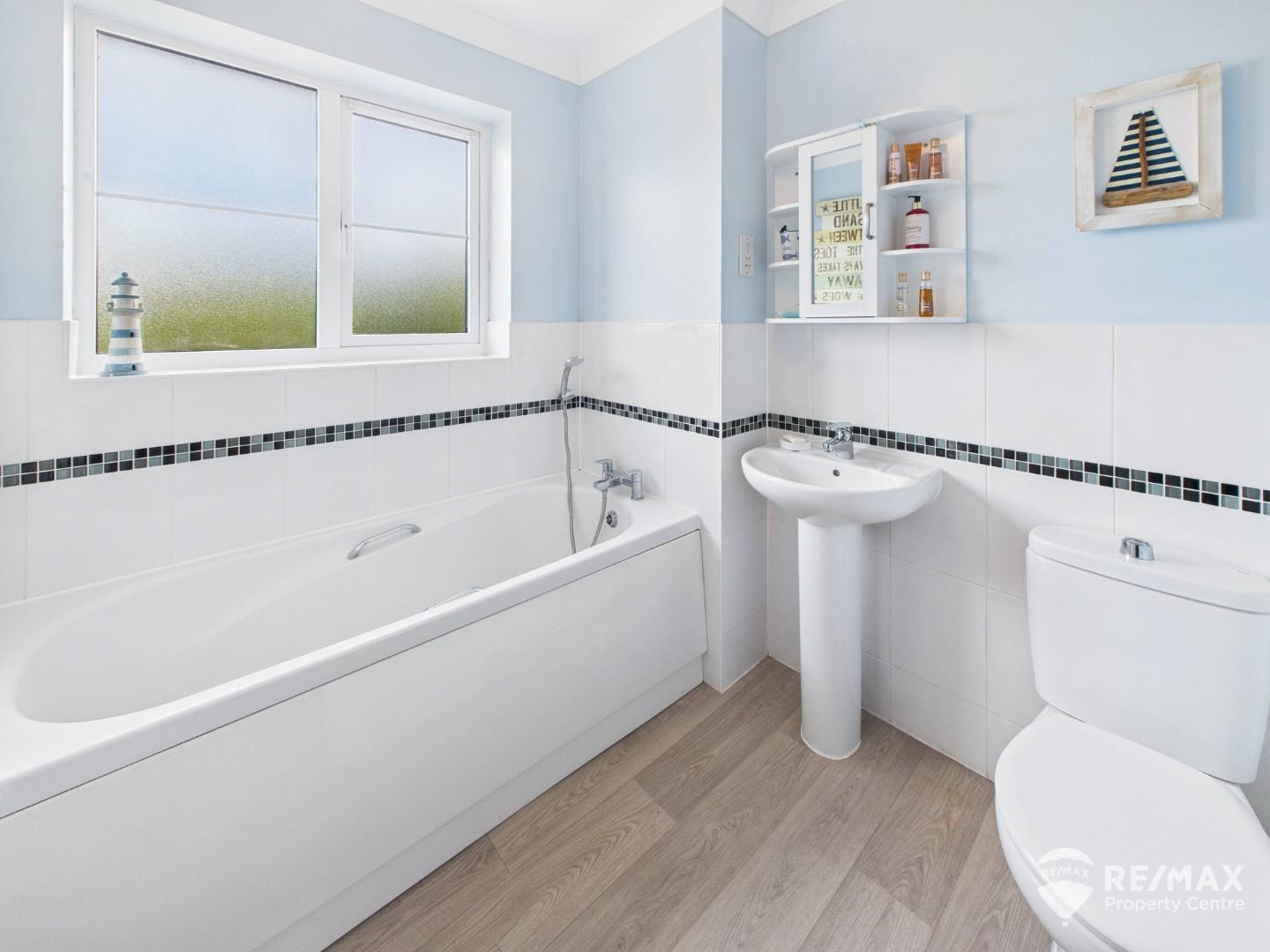 Opaque window to rear aspect, radiator, bath with mixer taps and hand held showerhead, low level WC and pedestal wash basin.