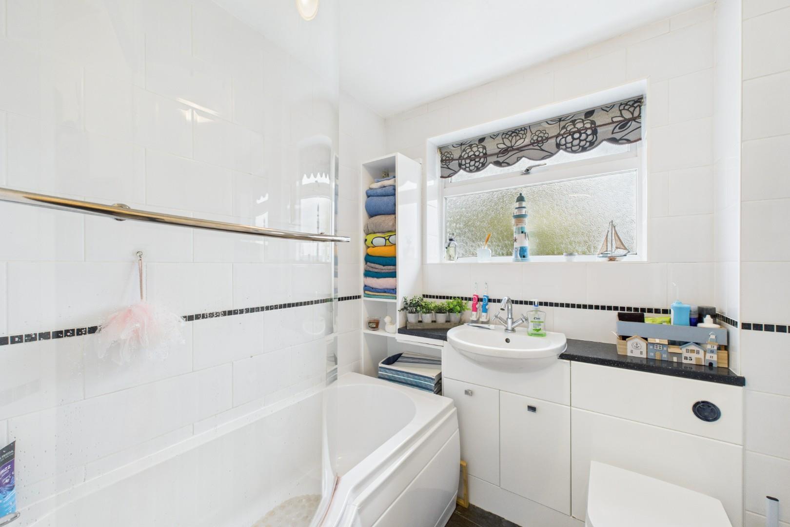 WC, wash hand basin, bath with shower over, central heating radiator.