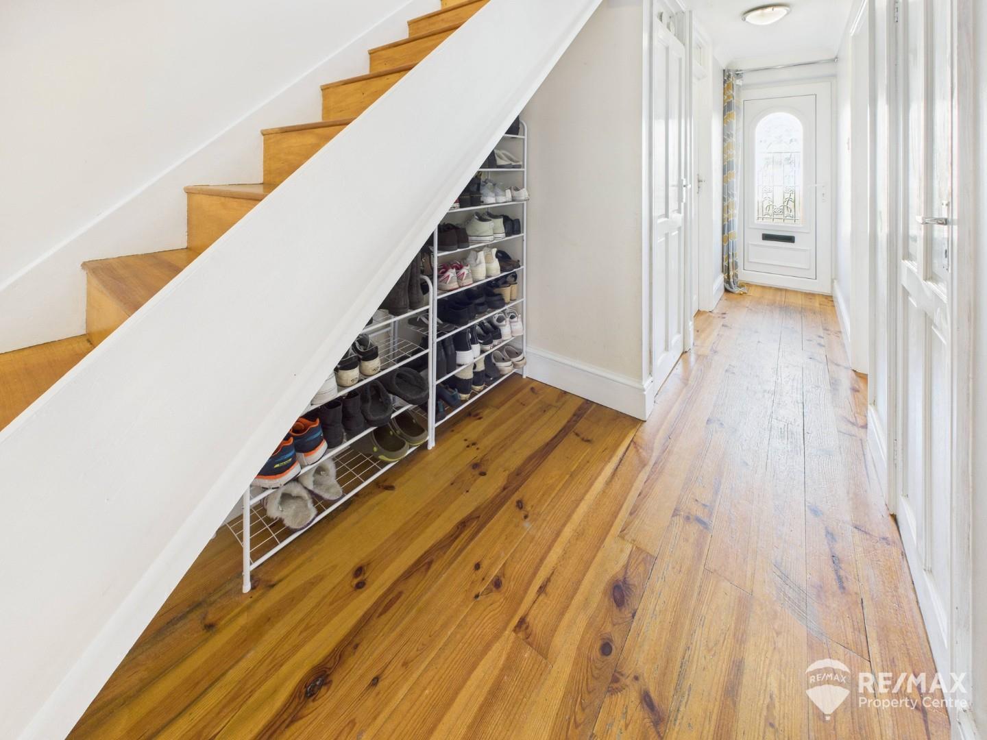 Spacious entrance hall with solid wood flooring, three storage cupboards, space under staircase, doors to all rooms, stairs to first floor and radiator