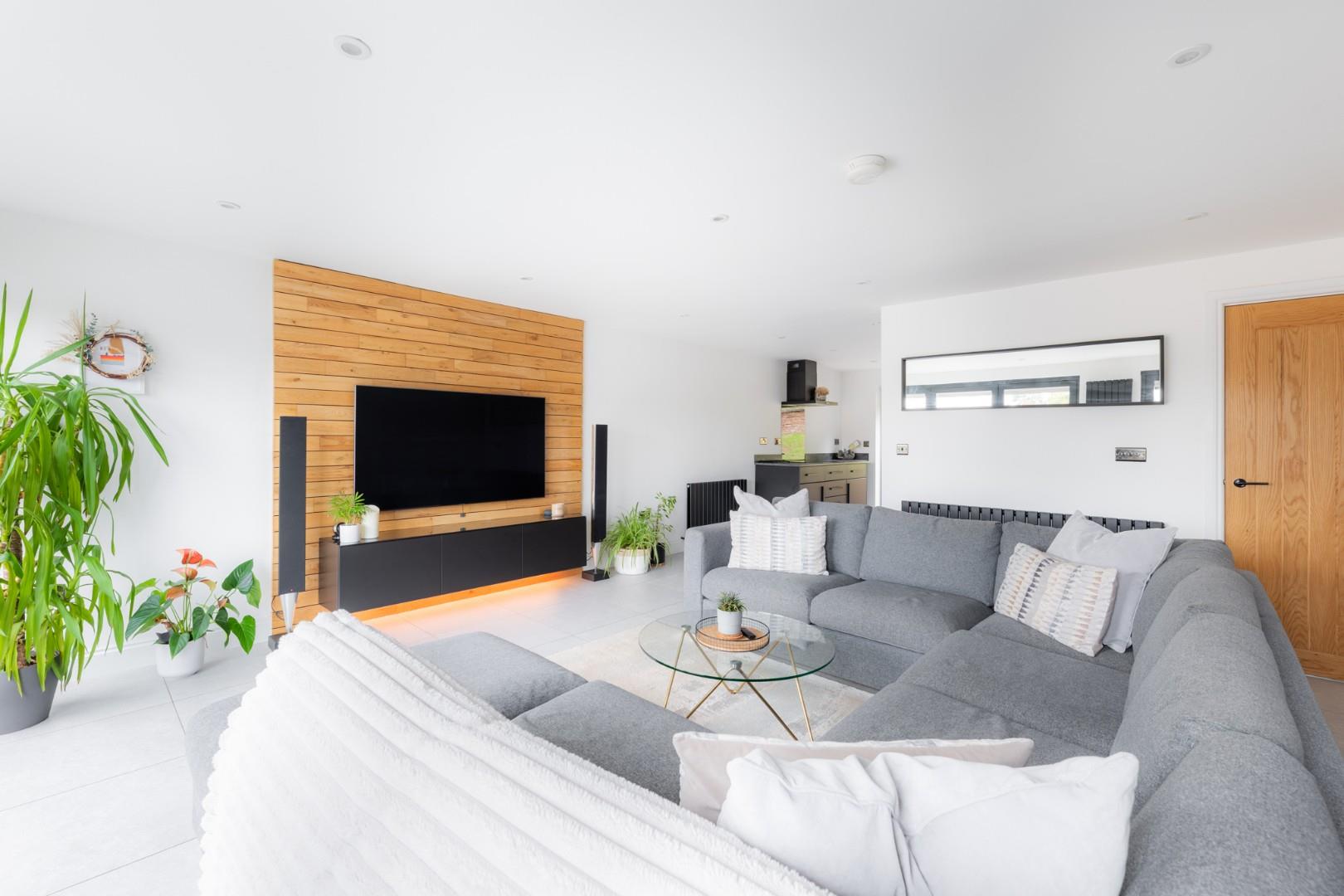 With a door leading from the garden, fitted with a range of wall and base units with worktops, integrated appliances including laundry machinery, fridge / freezer, dishwasher, oven with hob and extractor above and being open plan to the lounge