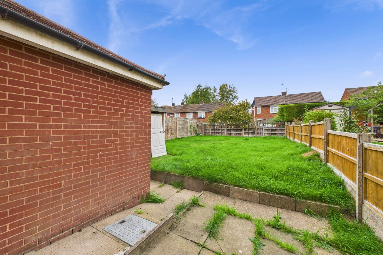 With a door leading from the kitchen, patio area to the front with lawn beyond, gate offering access to the side and a garden building currently used for storage