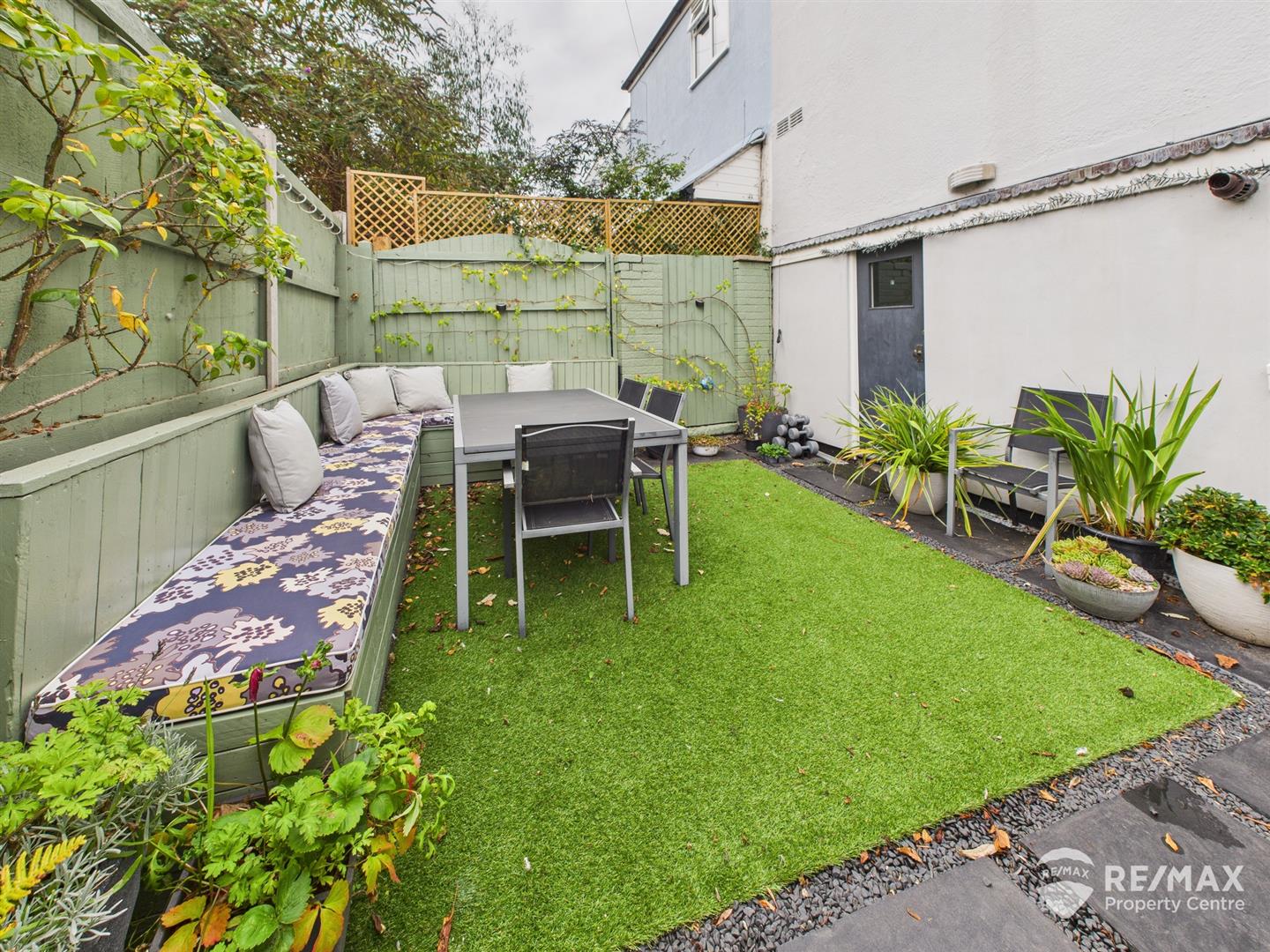 The characterful and low maintenance garden is to the side of the property and combines a seating area, artificial grass, a patio area, access to the garage/workshop (power and light connected), gated side access is also available