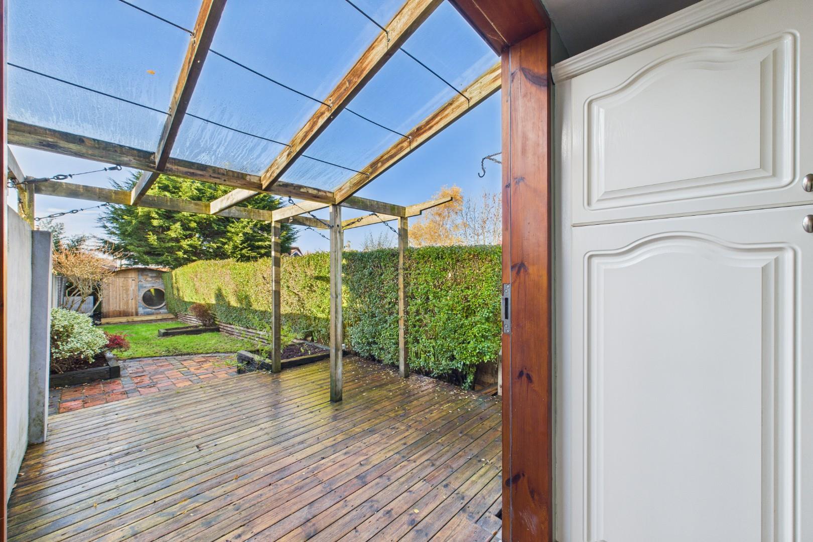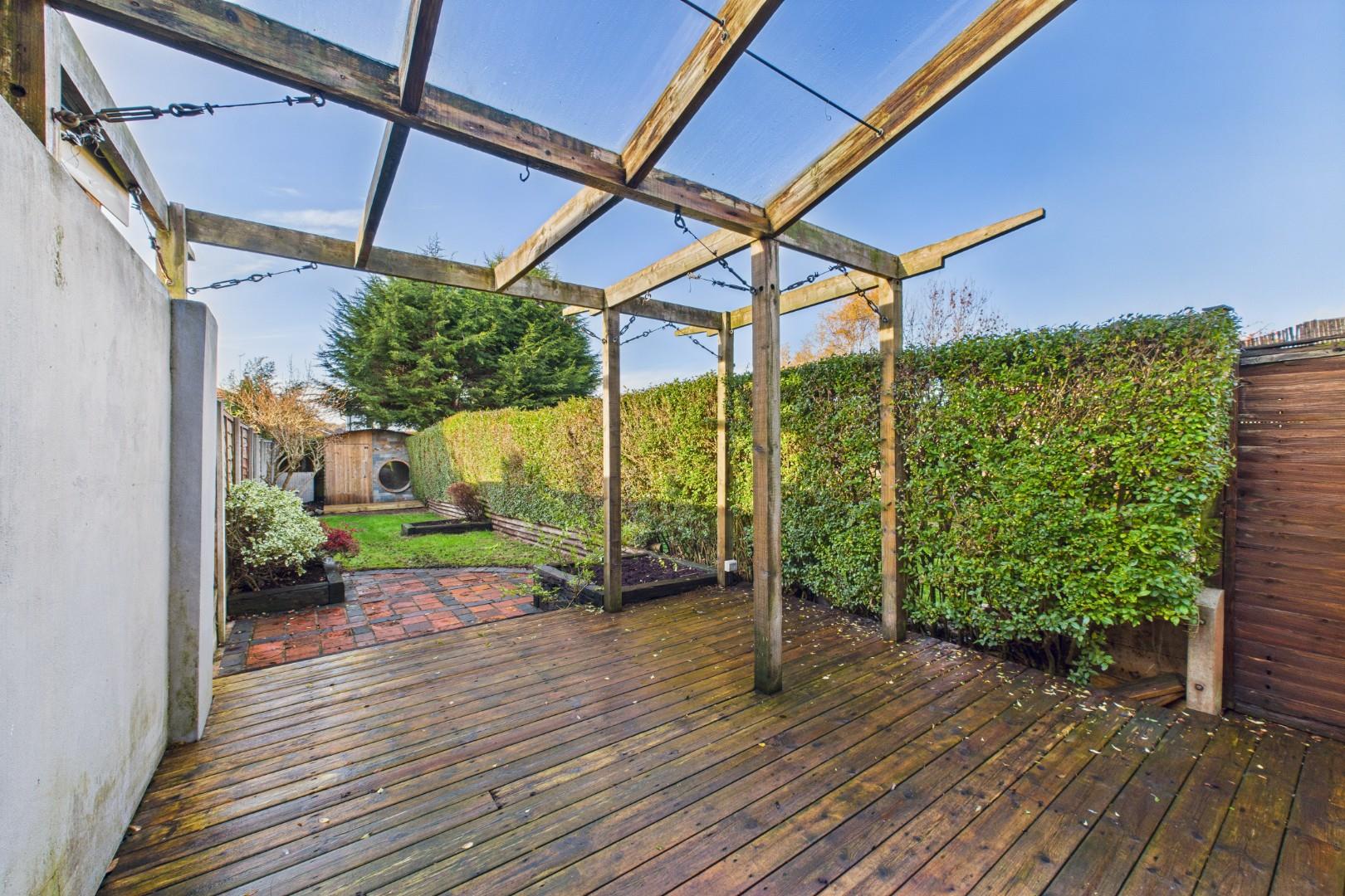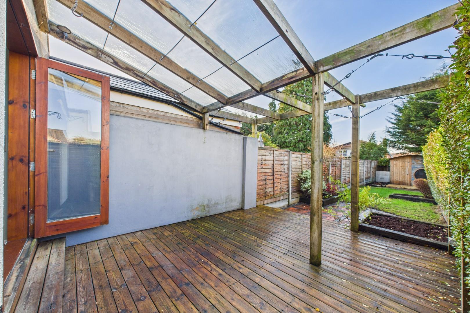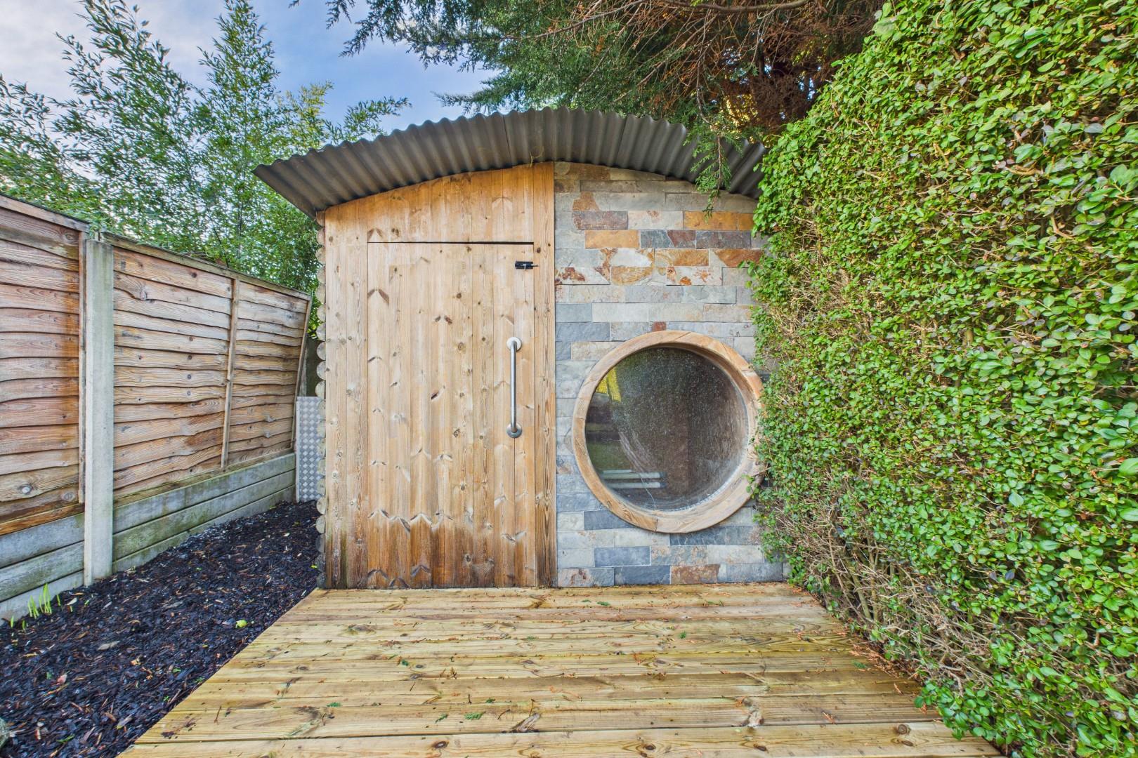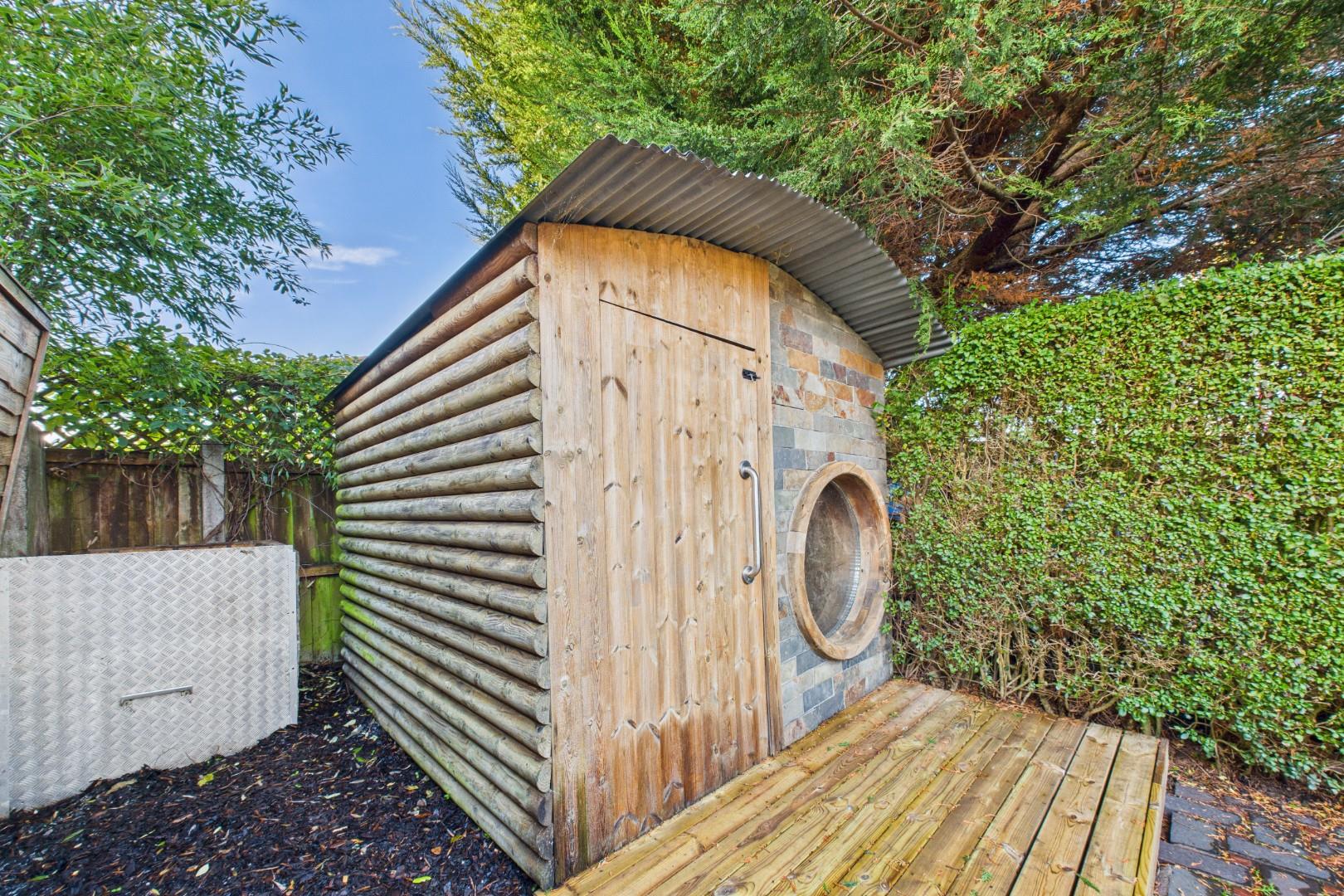 To the rear, a pleasantly landscaped garden with sheltered deck area and garden building to the rear
