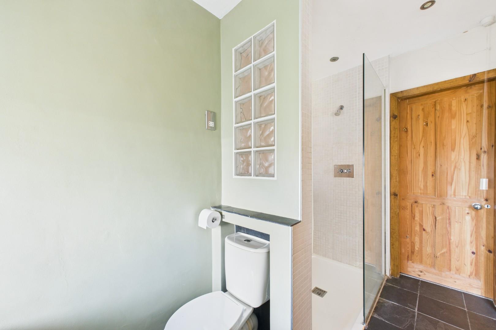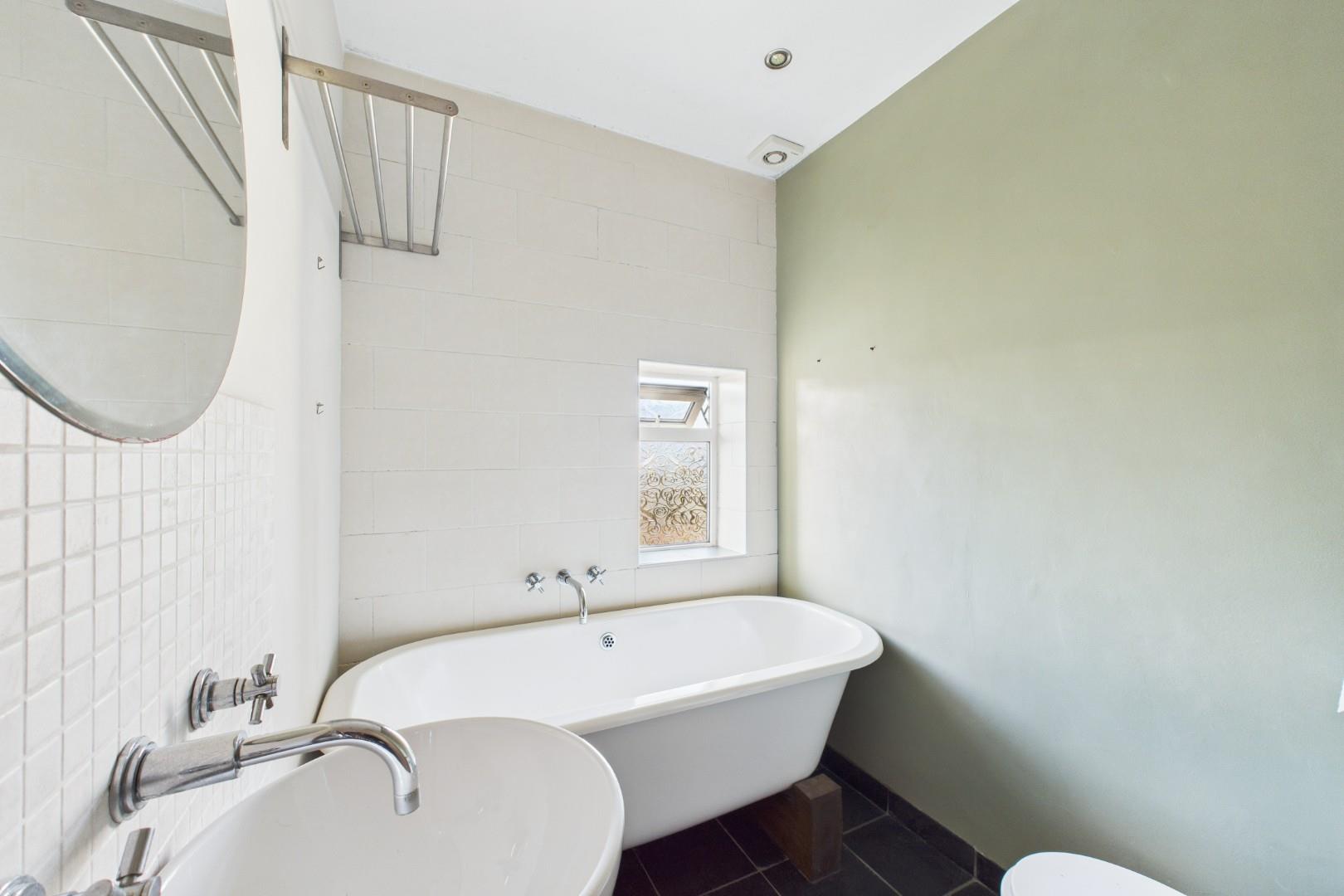 With doors leading from both bedrooms, WC, hand wash basin, freestanding roll-top style bath, walk in shower cubicle with full height tile surround, an obscured double glazed window to the rear and a central heating radiator