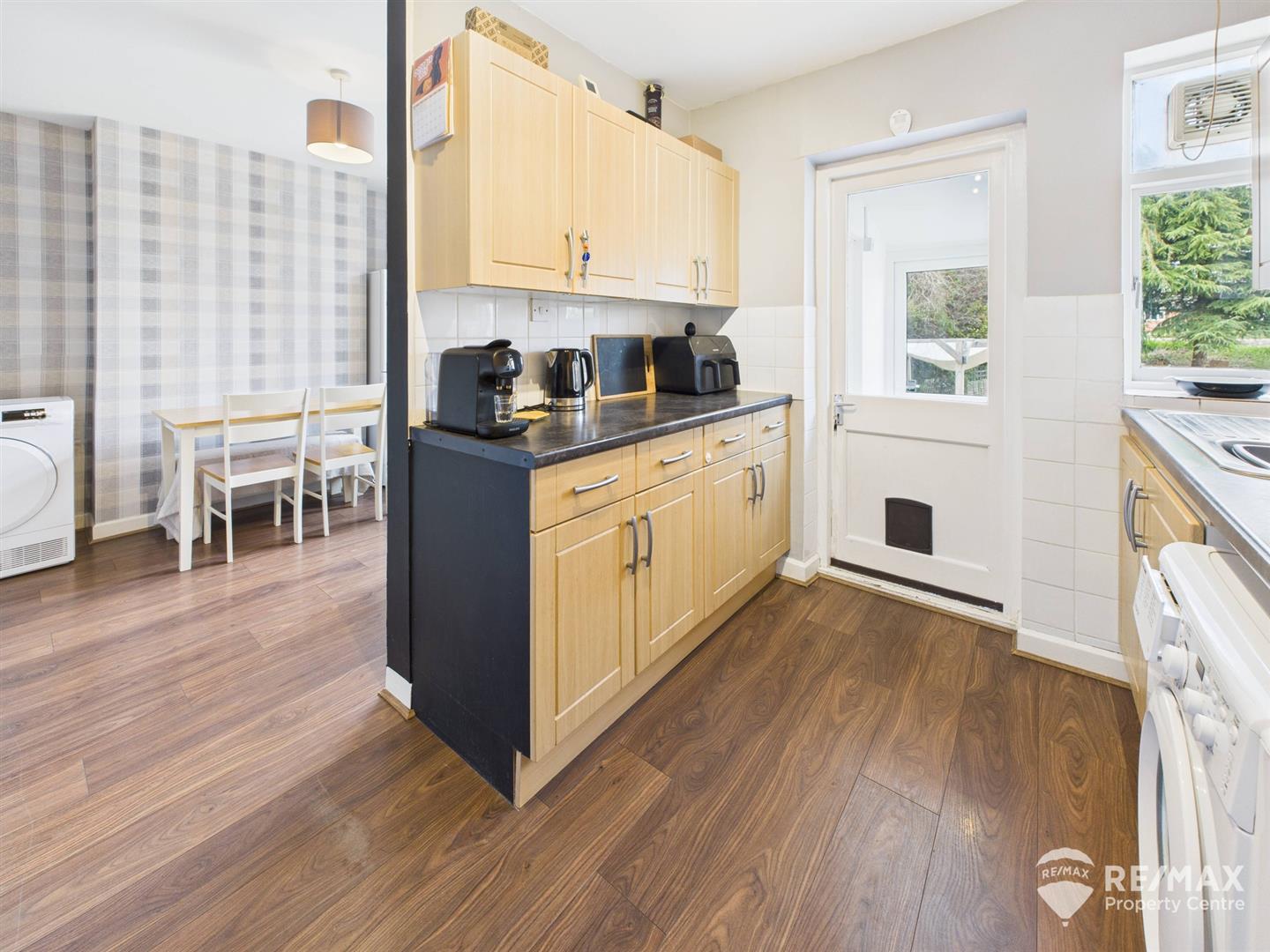 Fitted with a range of wooden wall and base units, stainless steel sink/drainer, electric oven, gas hob, plumbing and space for washing machine, space for under-counter fridge/freezer, complimentary wall tiling, with opening through to dining room, window to rear aspect, door to lobby, GF WC and rear garden