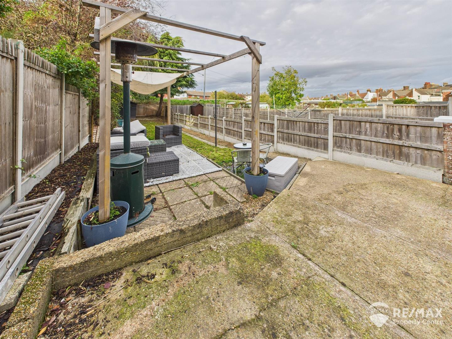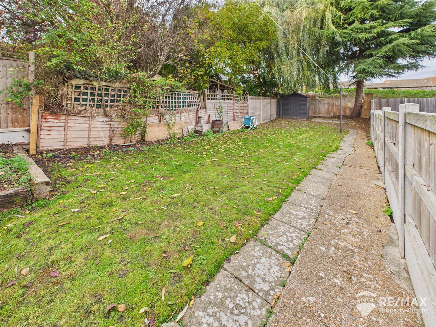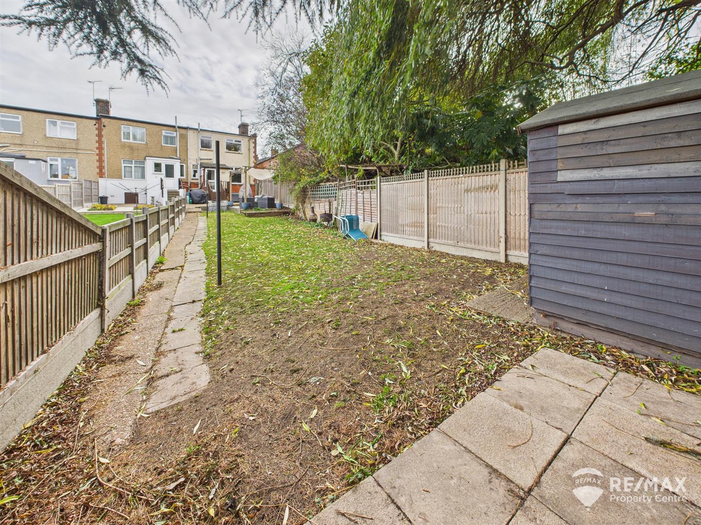 The fully enclosed and generous rear garden is accessed by wooden steps leading down to a hard standing/patio area, the remainder is laid to lawn with a further paved area to the rear of the garden, wooden shed to remain (power & light connected), outside tap, gated side access and door to cellar area which can be used for storage