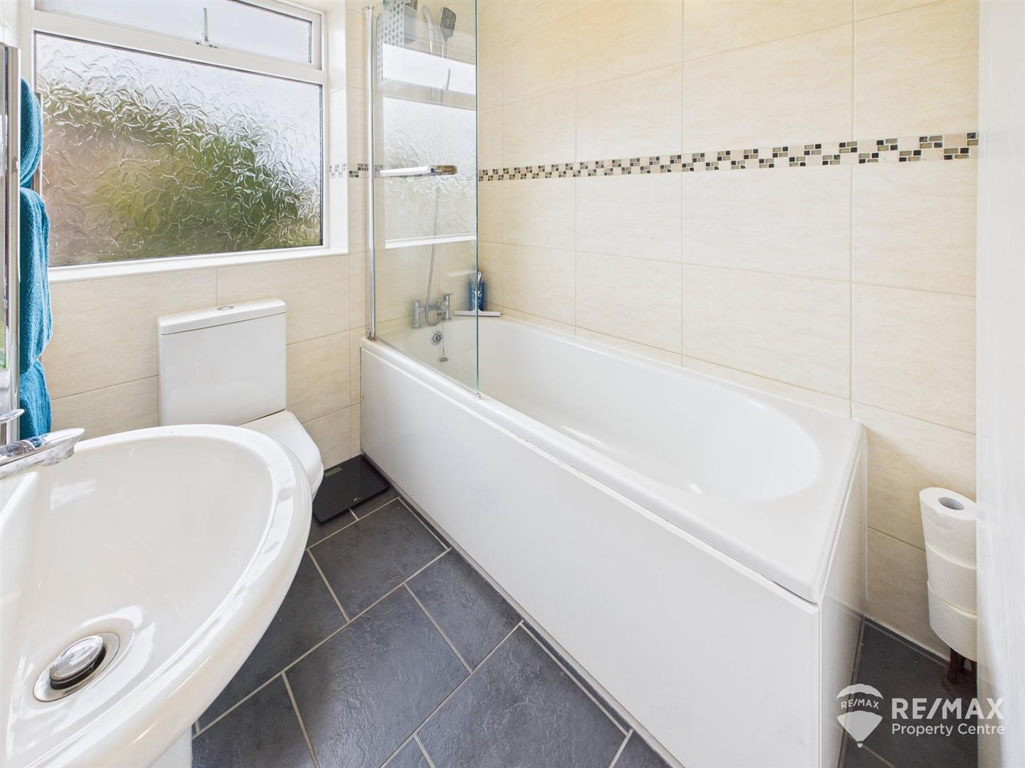 Suite comprising:- panelled bath with mixer tap and wall mounted shower attachment, glass screen, pedestal wash basin, low level WC, heated towel radiator, fully tiled walls and opaque window to rear aspect