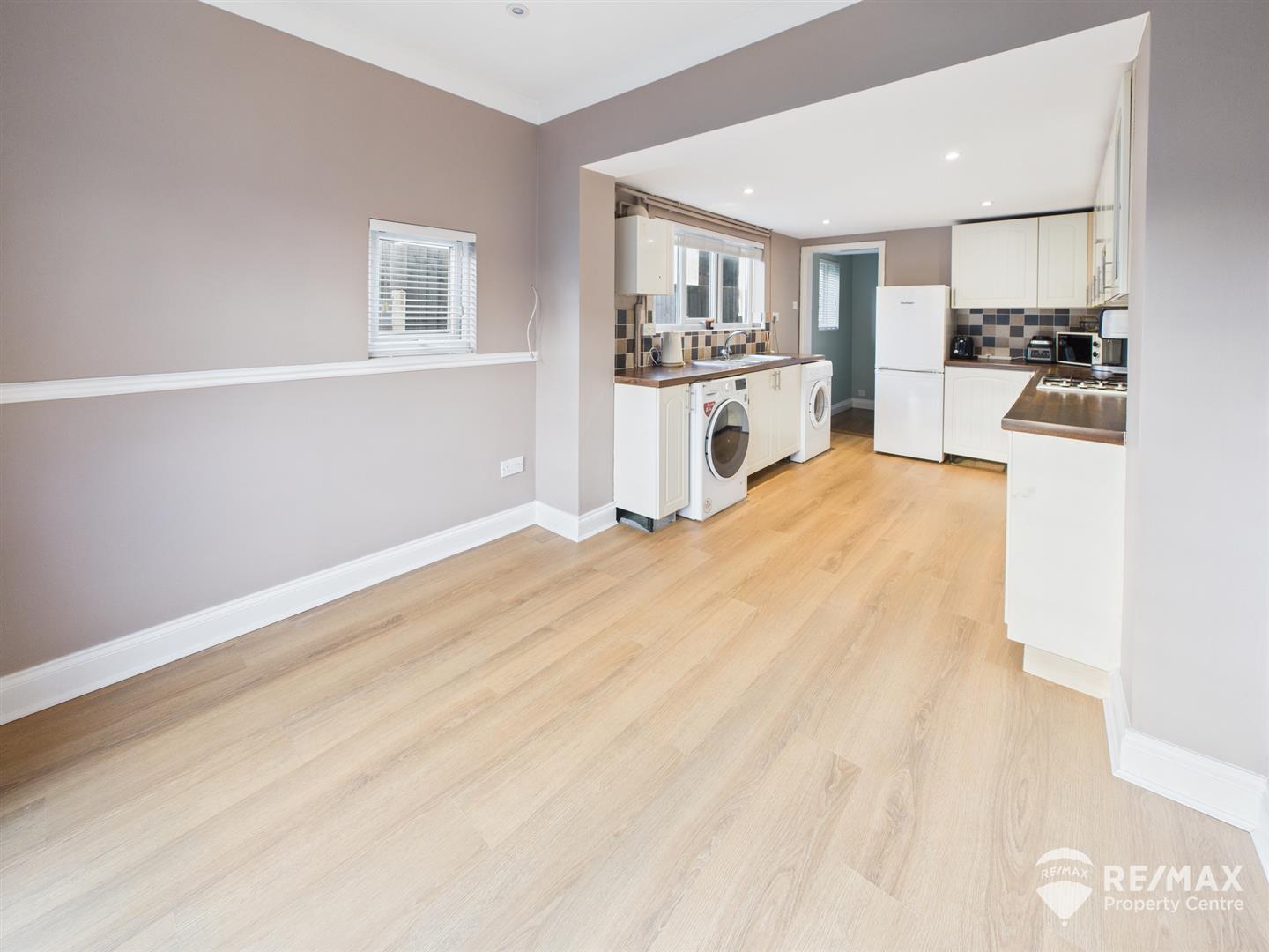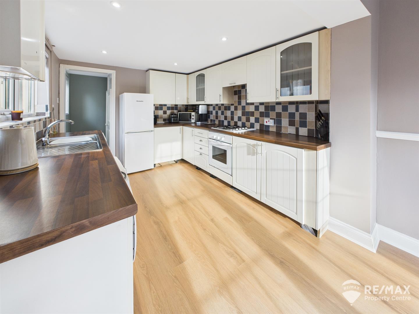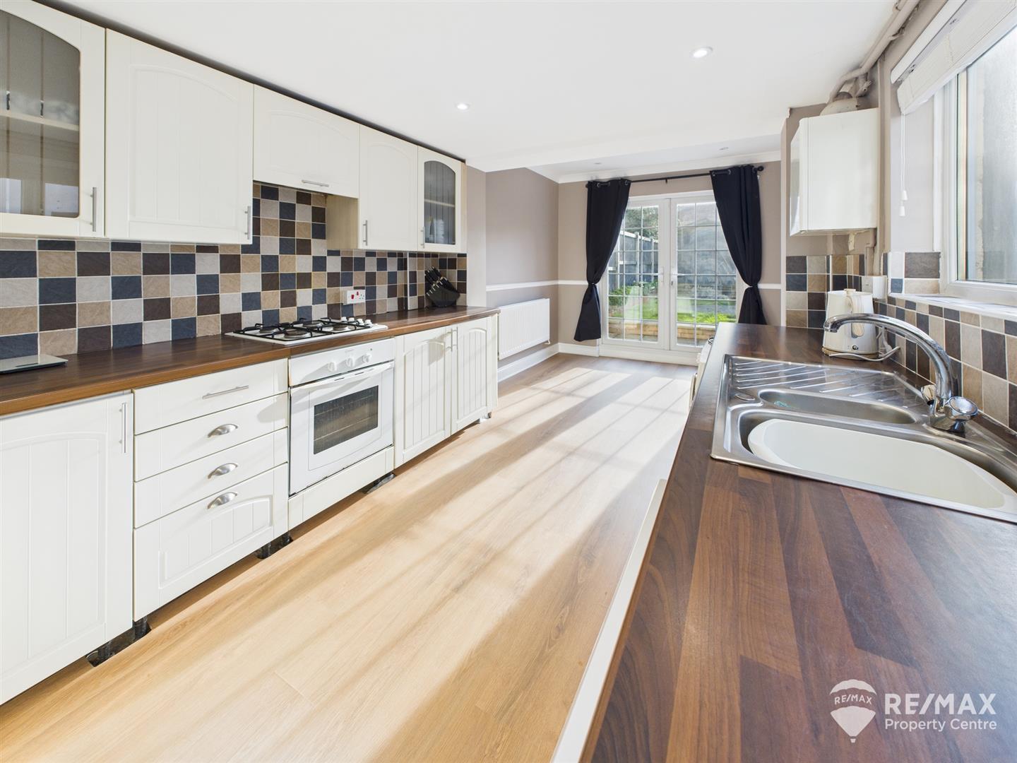 Fitted with a matching range of wall and base units, spaces for fridge/freezer, washing machine and tumble dryer, built in oven, gas hob with extractor, stainless steel sink and drainer, wall mounted gas boiler, complimentary wall tiling, 2 windows to side aspect, French doors leading out to rear garden
