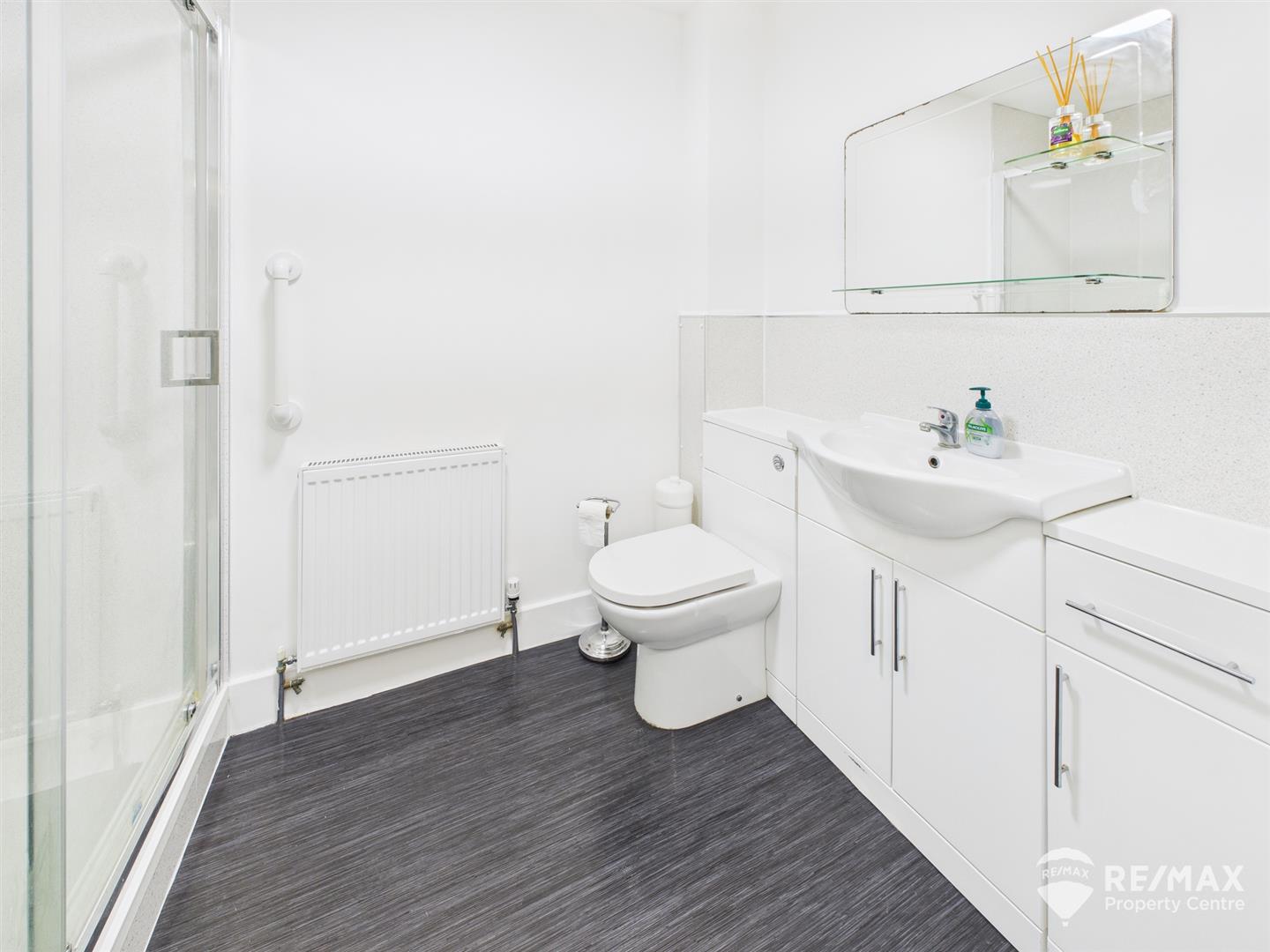 Modern suite comprising:- double walk in shower, wash hand basin set in vanity storage unit, low level WC, fitted hand rail and extraction fan