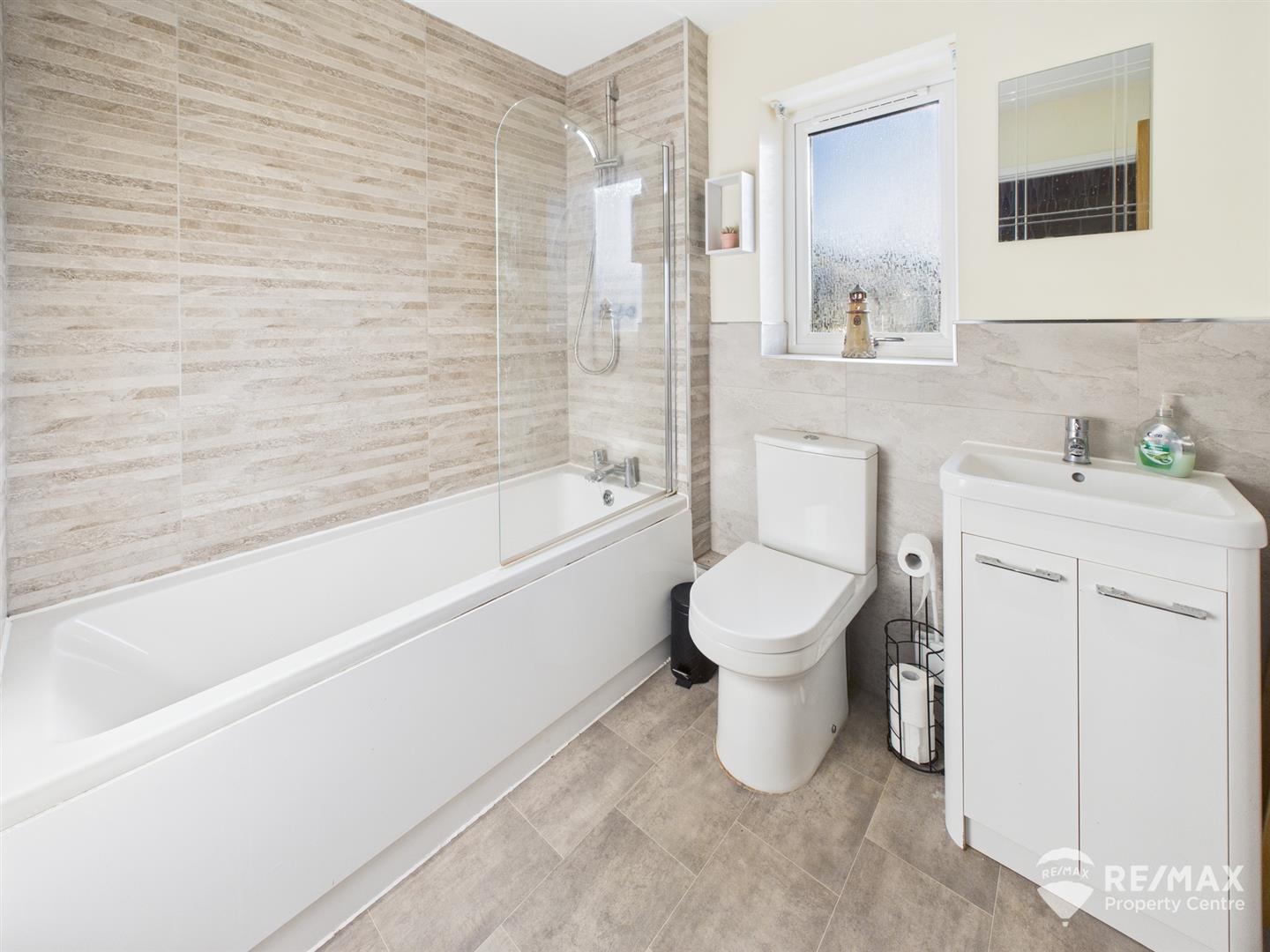Suite comprising:- Panelled bath with wall mounted shower and glass screen, wash basin in vanity unit, low level WC, heated towel radiator, extractor, part tiled walls and opaque window to rear aspect
