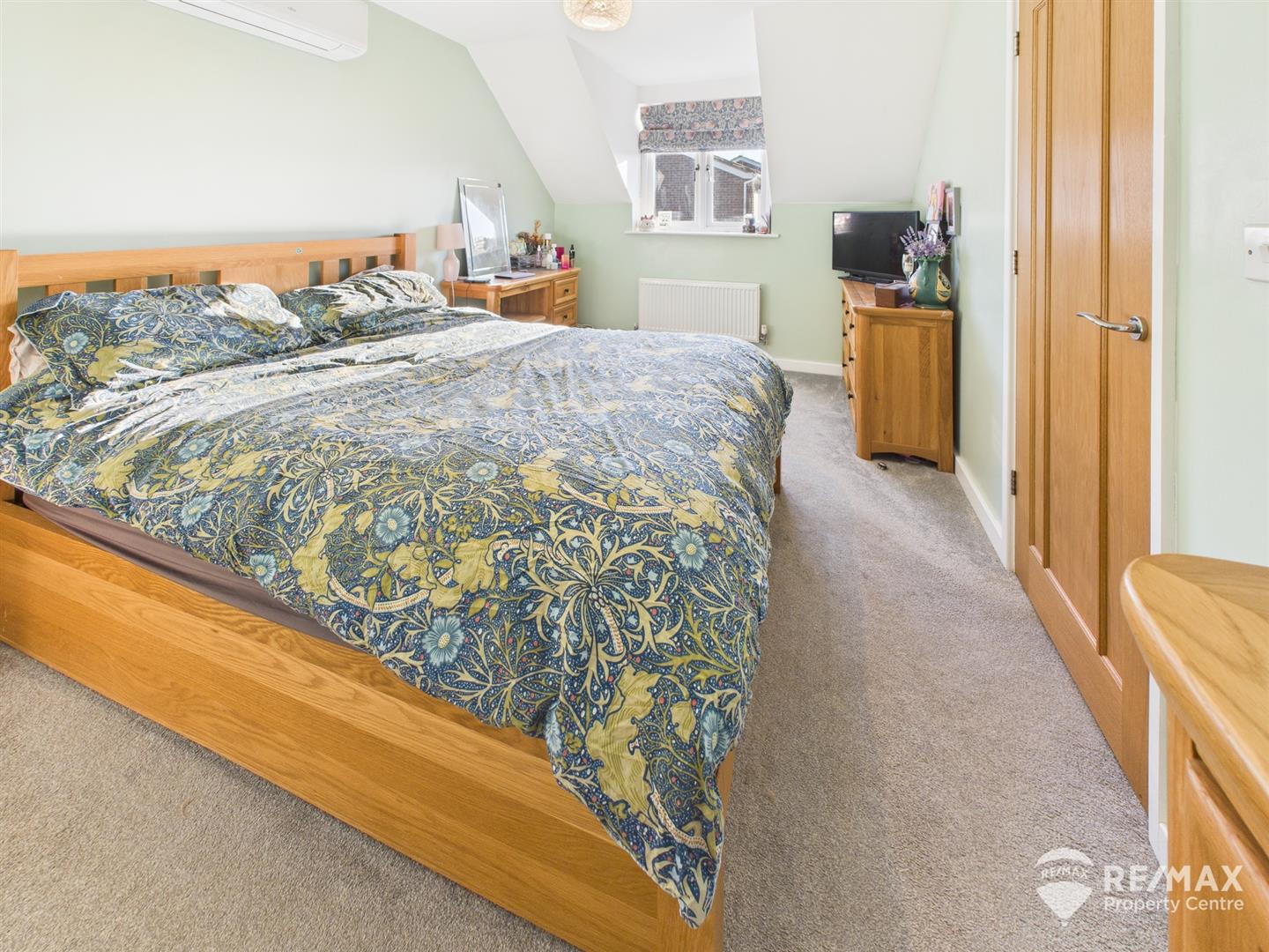 With Dorma window to rear aspect, wall mounted air conditioning unit and door leading to en-suite