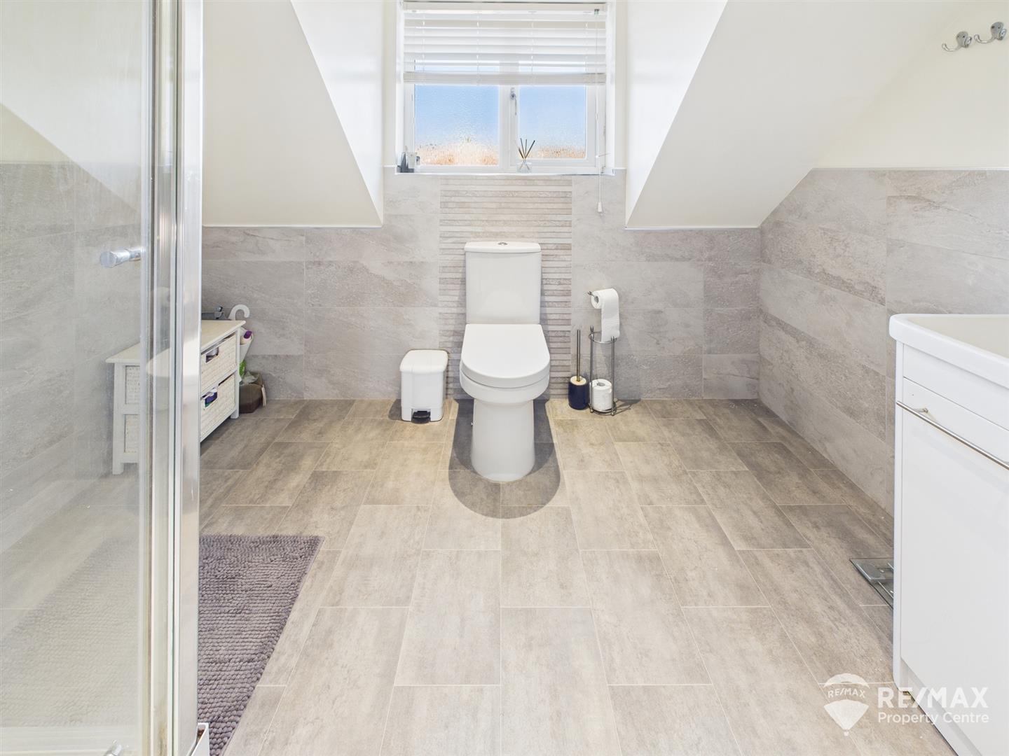 Suite comprising :- Double shower cubicle, wash basin in vanity unit, low level WC, heated towel radiator, part tiled walls, with opaque Dorma window to front aspect