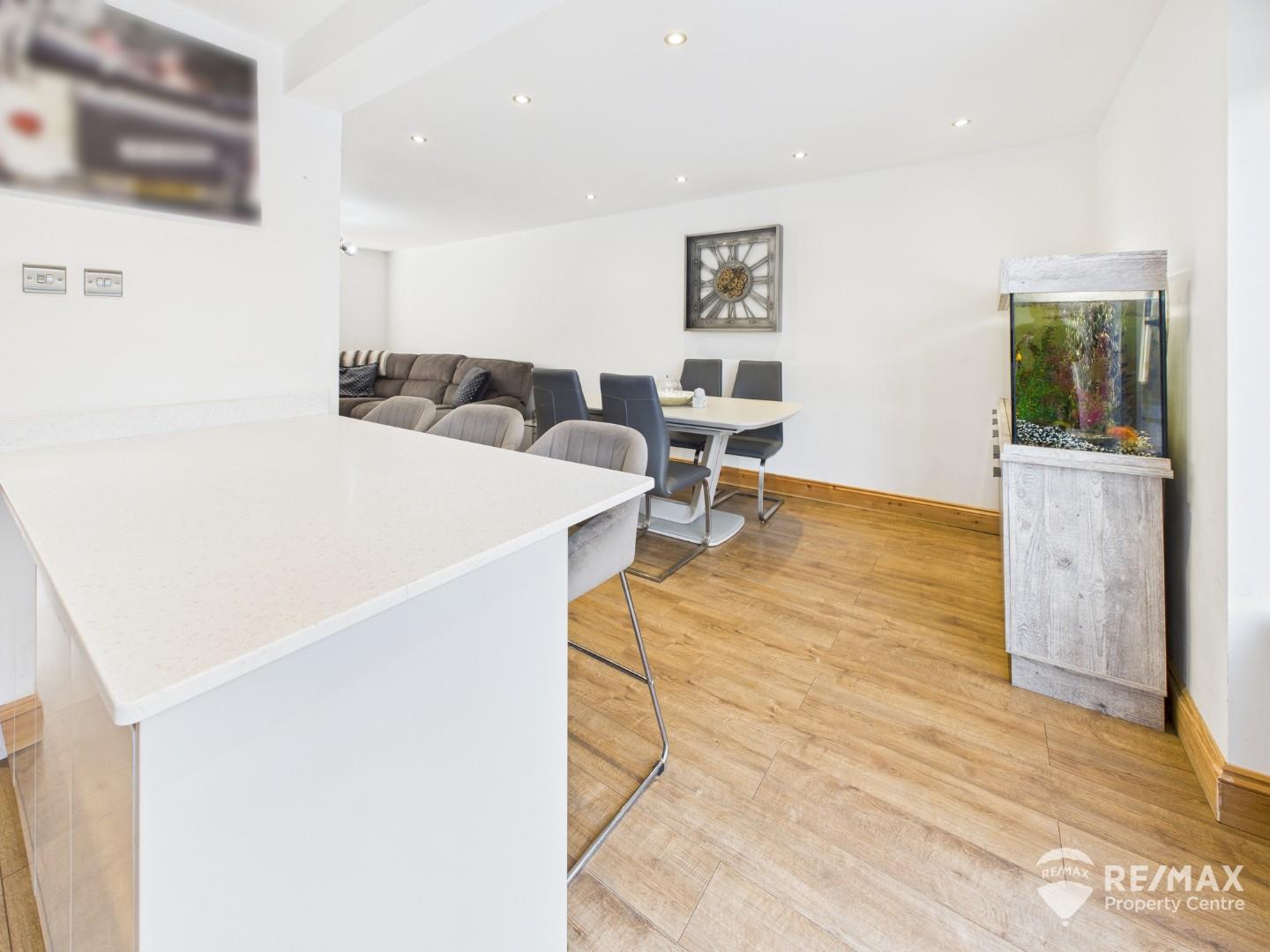 UPVC double glazed bi-fold patio doors and windows to rear, fitted resin worktop breakfast bar, range of fitted units comprising eye & base level cupboards, resin worktops, inset stainless steel sink with drainer & instant boiling mixer tap, tiled splash backs, space for range cooker with Perspex splashback & large stainless steel cooker hood, integrated dish washer, glazed door to utility room