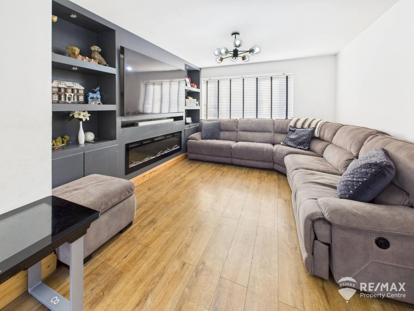 UPVC double glazed window to front with fitted venetian blind, double radiator, fitted media wall with inset electric fireplace, shelving & storage cupboards