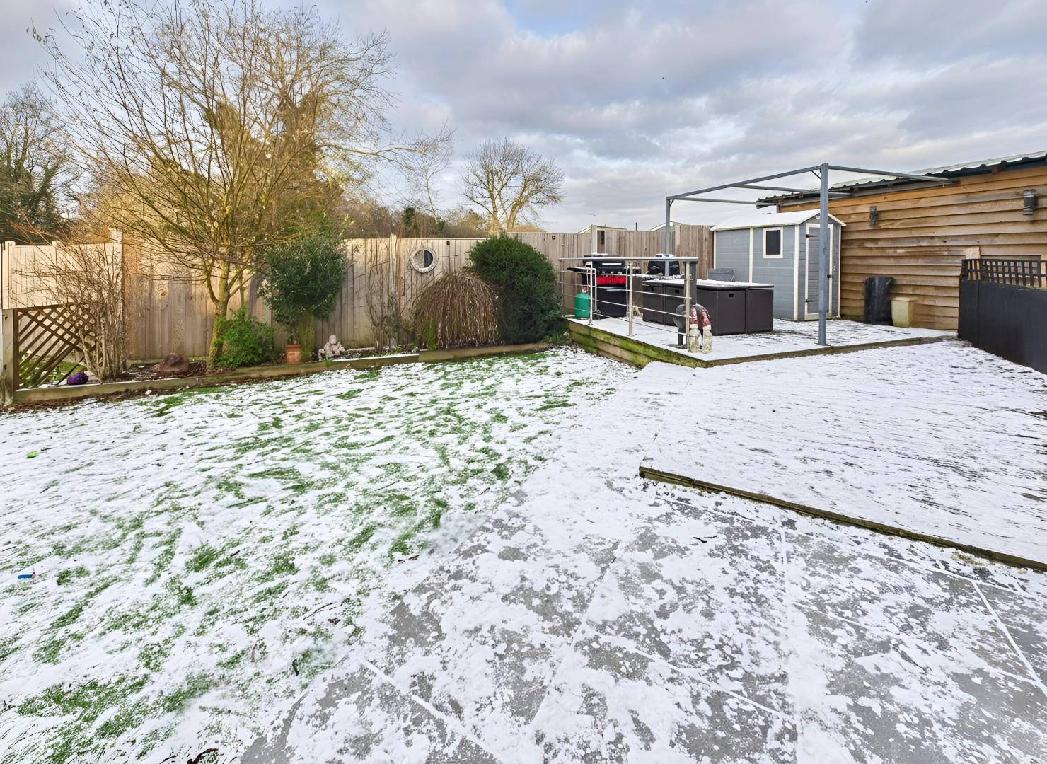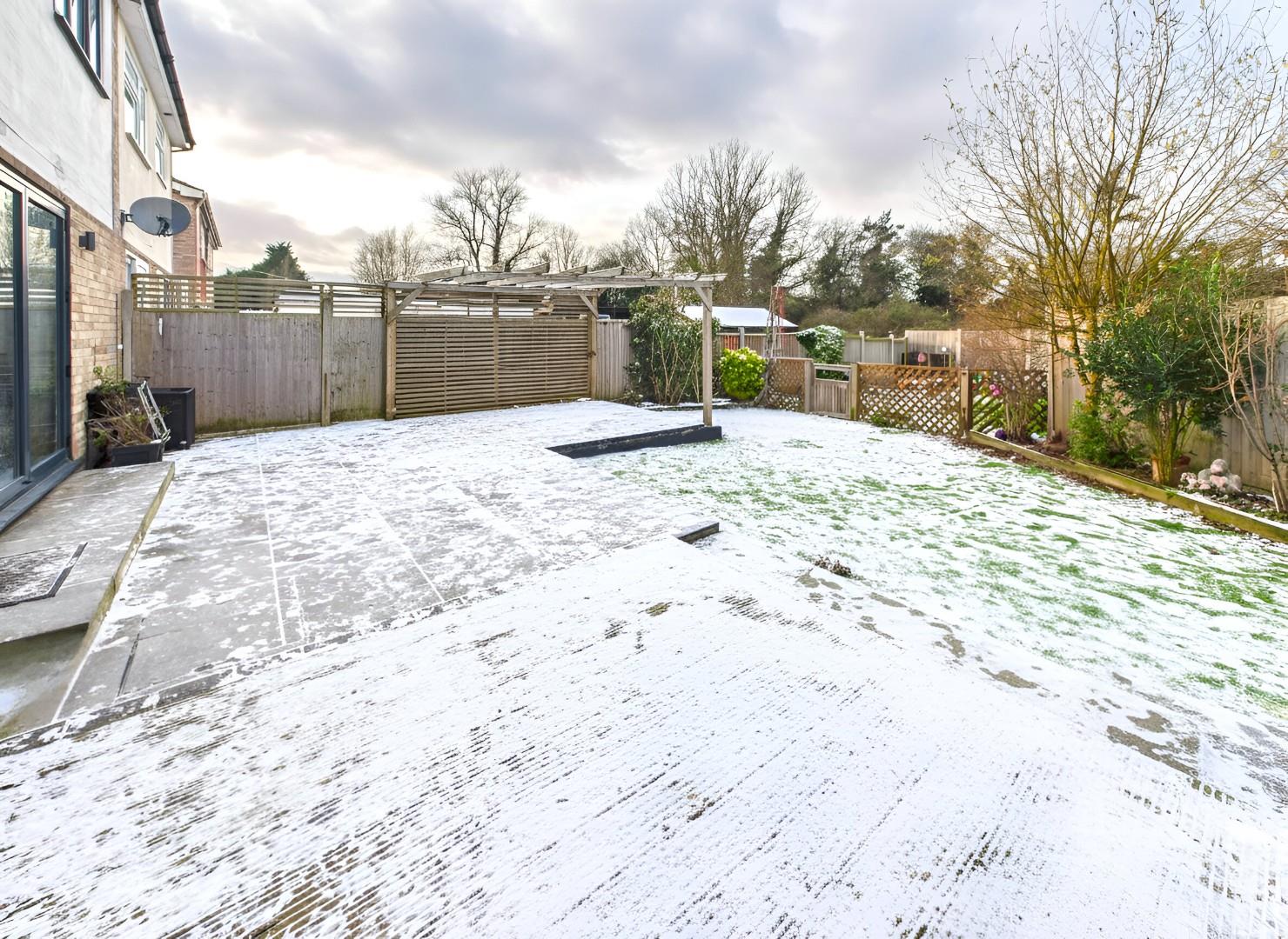 To the rear - Large enclosed rear garden (Approx. 60' x 28' extending to max 70') with paved & decked patio areas, wooden pergola seating areas, detached garage with electric roller door, power & light connected, side bbq/storage area, corner plot