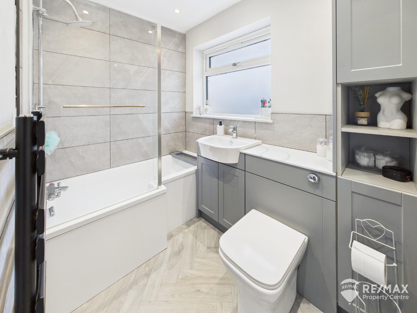 UPVC double glazed opaque window to rear, part-tiled walls, vanity hand washbasin with mixer tap & cupboard, close-coupled WC, heated towel radiator, P-shaped bath with overhead shower and mixer taps